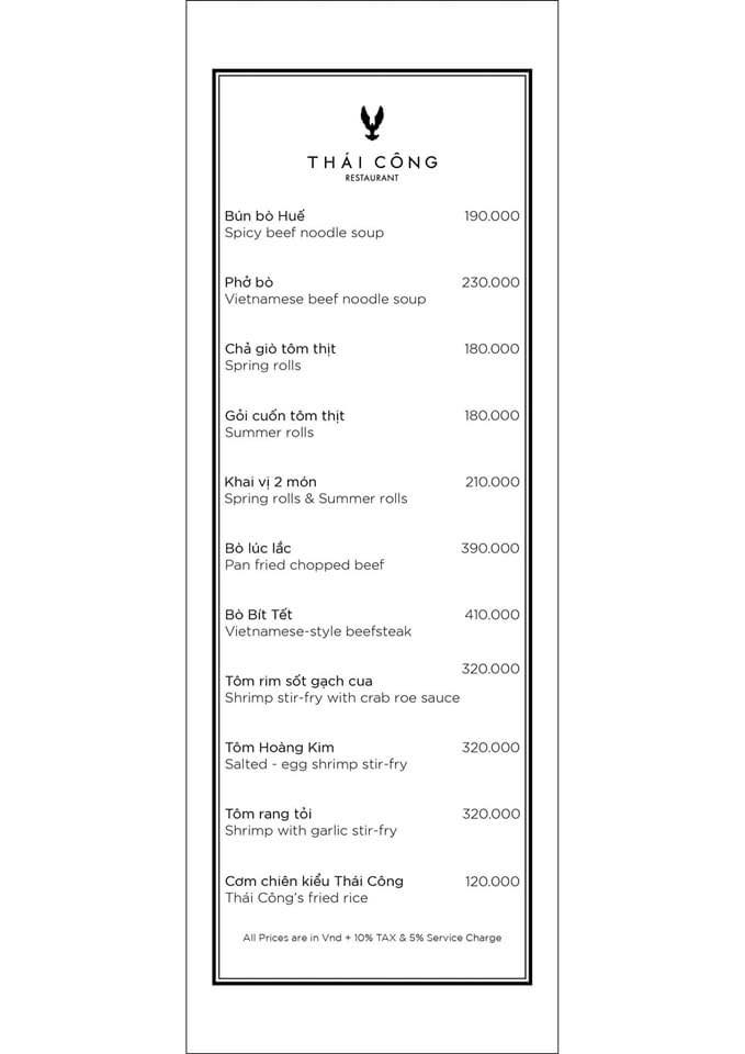 Một yếu tố khác "dấy lên" tranh cãi khi nhắc tới nhà hàng này là giá cả đắt đỏ. Cơm rang giá 120.000 đồng, phở bò giá 230.000 đồng... Dễ thấy mức giá này cao gấp 3-4 lần so với những món ăn bình dân ở ngoài, thậm chí đây còn là mức giá này còn chưa có thuế VAT và phí phục vụ.