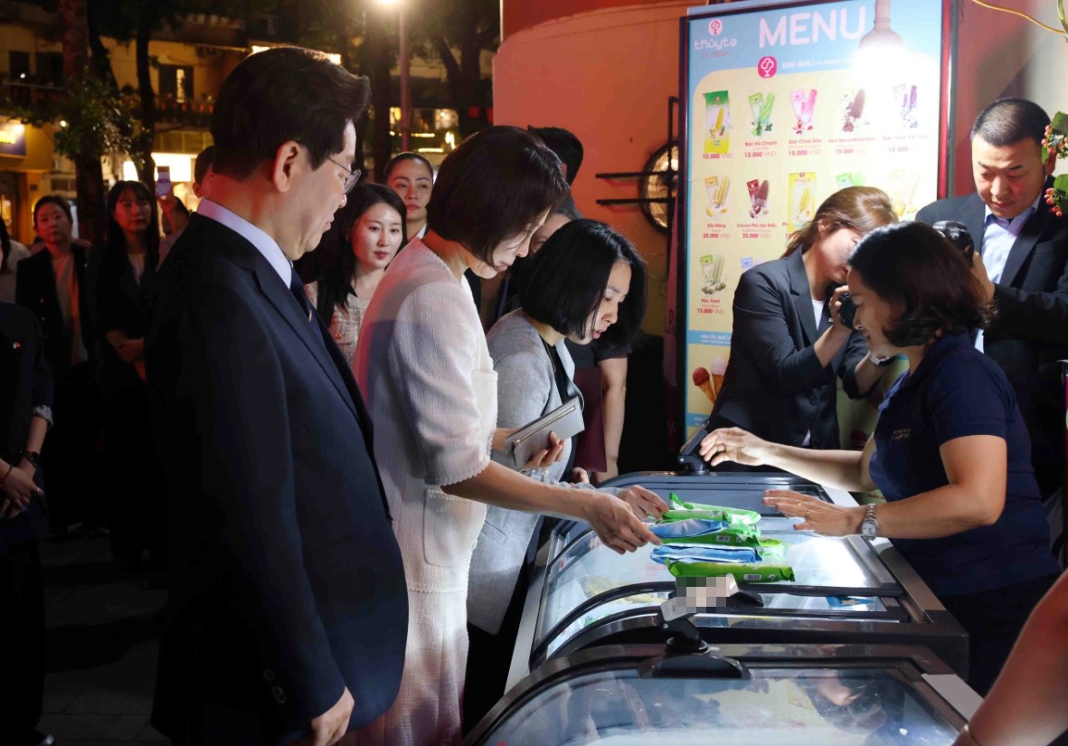 Một trong những khoảnh khắc đời thường gây ấn tượng là khi Phu nhân Kim Hye Kyung dừng chân tại Kem Thủy Tạ và tự tay mua kem cho cả đoàn. Giữa không gian mát mẻ bên hồ, hình ảnh Phu nhân vừa thưởng thức kem, vừa ngắm phố phường mang lại cảm giác gần gũi, giản dị nhưng đầy sức hút.
