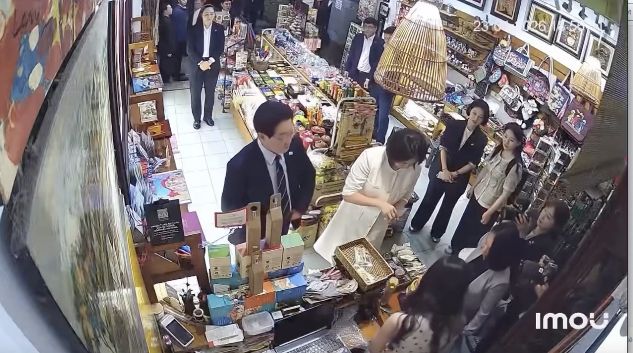 Tại một cửa hàng lưu niệm, Tổng thống và Phu nhân đã dừng chân trải nghiệm, thích thú đội thử nón lá, biểu tượng văn hóa quen thuộc của Việt Nam. Phu nhân Kim Hye Kyung lựa chọn mua một số món quà nhỏ như khui bia và nam châm dán tủ lạnh, trong khi Tổng thống cũng tò mò thử một chiếc sáo chim - món đồ chơi dân gian phát ra âm thanh vui tai.