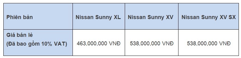 Hiện mẫu xe Nissan Sunny được bán tại Việt Nam bao gồm 3 phiên bản với giá bán chính thức như sau: