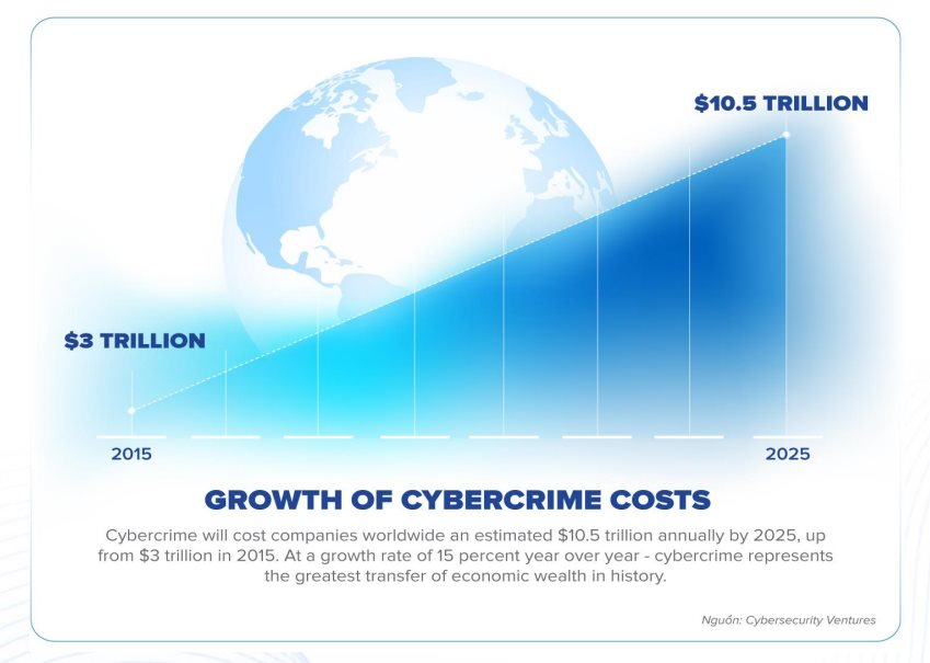 Bên cạnh đó, báo cáo của VSEC cũng cho thấy tổng thiệt hại do tội phạm mạng năm 2025 ước tính đạt 10,5 nghìn tỷ USD trên toàn cầu (tăng 31% so với năm 2024), tương đương mức tổn thất 333.000 USD mỗi phút (8,6 tỷ đồng).