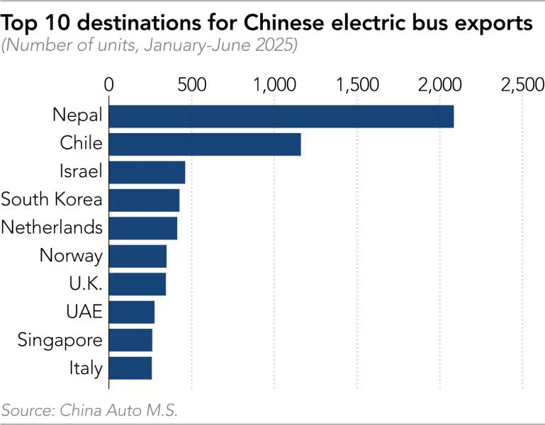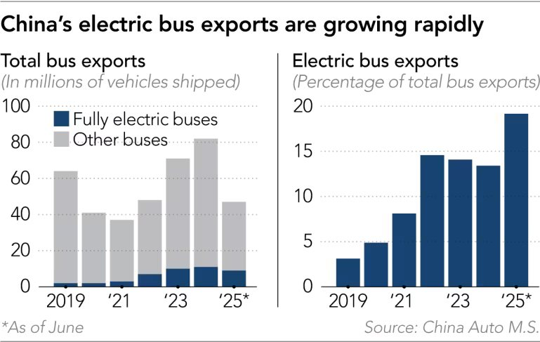 Trên toàn cầu, các nhà sản xuất Trung Quốc đang thống lĩnh xuất khẩu xe buýt điện, dẫn đầu là Yutong Bus và Xiamen King Long United Automotive Industry. Thậm chí xu hướng này đang tăng tốc khi chỉ trong nửa đầu năm 2025, số liệu của China Auto M.S cho thấy Trung Quốc đã xuất khẩu khoảng 9.000 xe buýt điện hoàn toàn ra thế giới, tăng 124% so với cùng kỳ năm trước, so với mức tăng 14% của cả năm 2024.