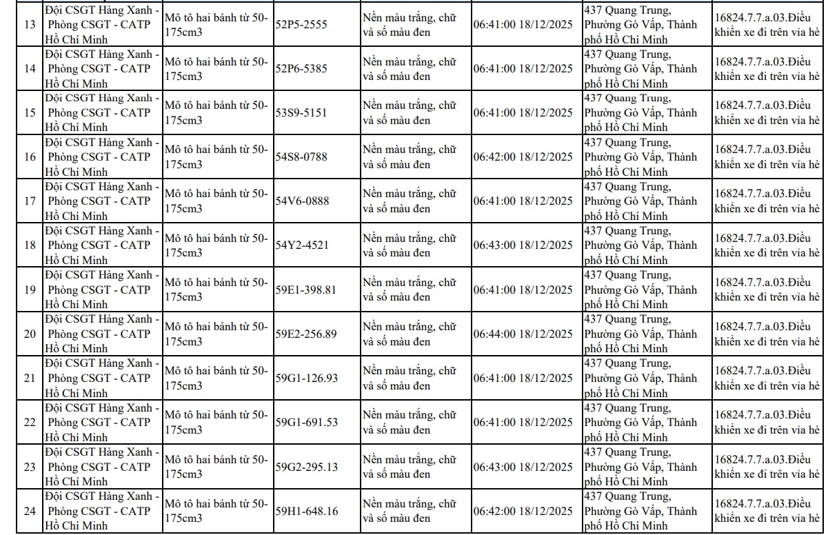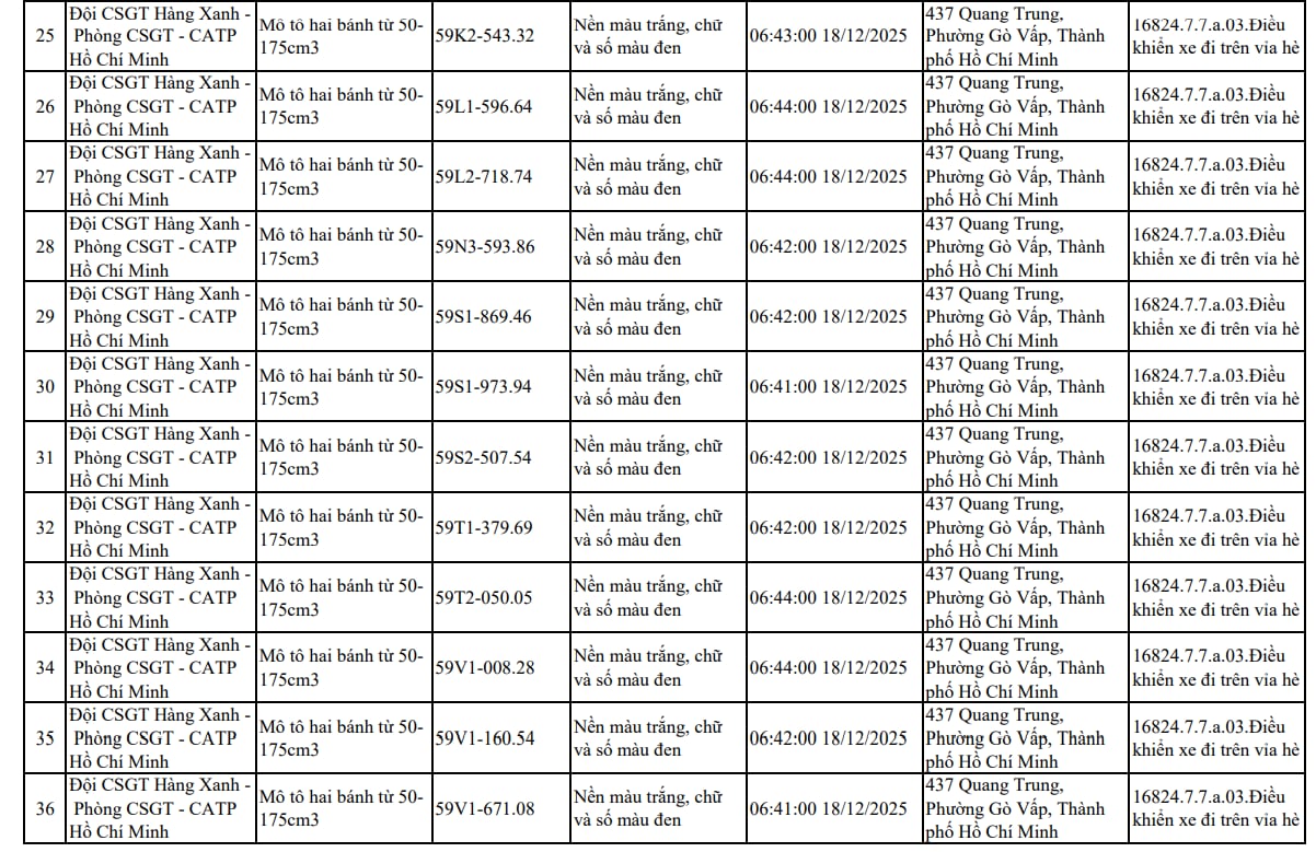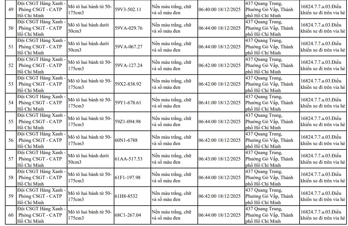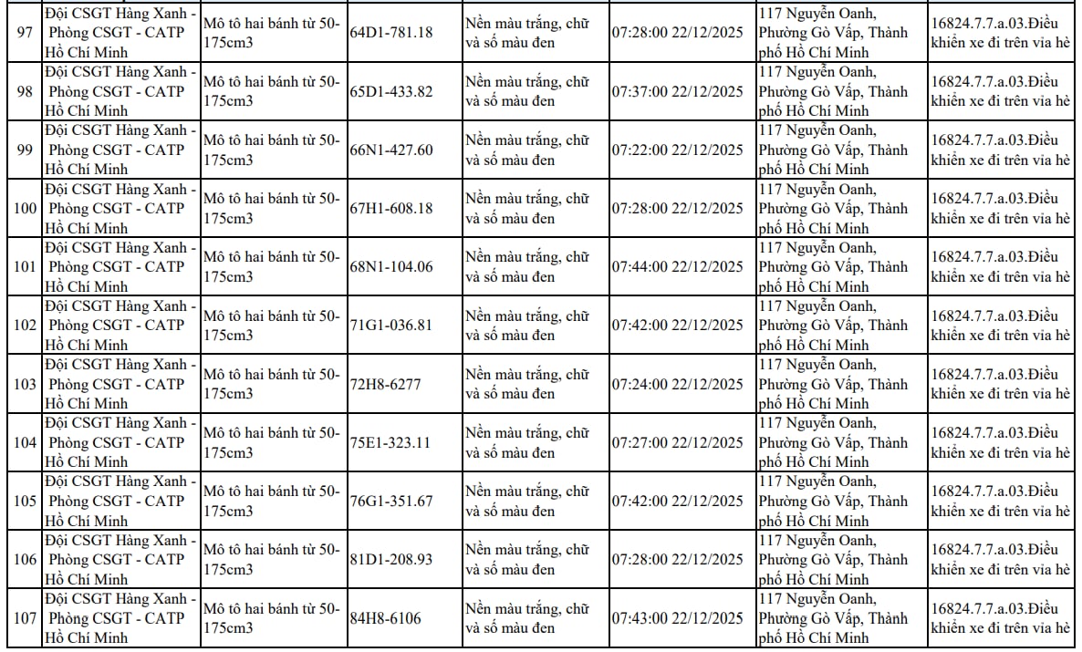 Phòng Cảnh sát Giao thông, Công an TP.Hồ Chí Minh mới đây đã công khai danh sách hơn 100 xe máy đi trên vỉa hè được Đội Cảnh sát Giao thông Hàng Xanh ghi hình, xử phạt trên các tuyến đường thuộc phường Gò Vấp.