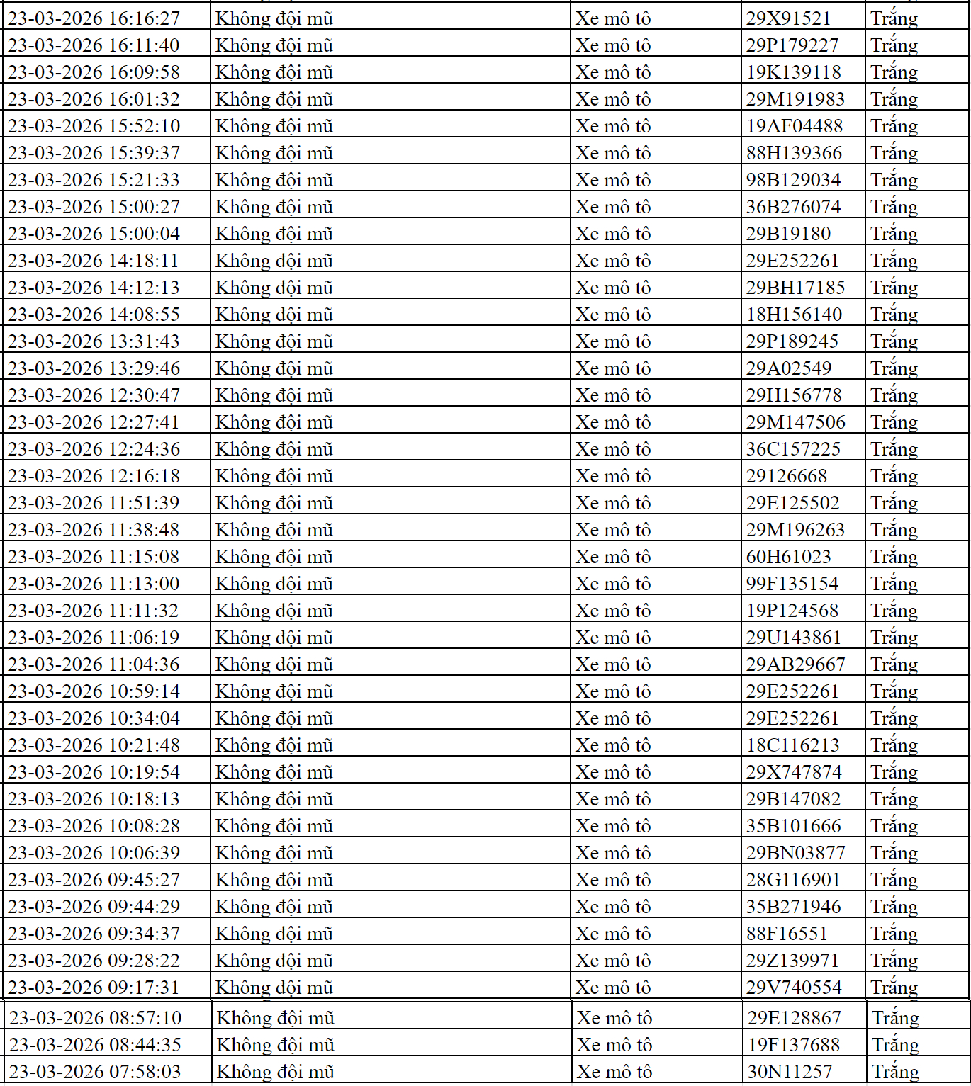 Cũng theo Cục Cảnh sát giao thông thông báo, từ 7h30 ngày 23/3/2026 đến 7h30 ngày 24/3/2026, hệ thống camera ứng dụng trí tuệ nhân tạo (AI) của Cục Cảnh sát giao thông đã ghi nhận, phân tích và hỗ trợ phát hiện nhiều hành vi vi phạm trật tự an toàn giao thông trên các tuyến cao tốc và địa bàn đô thị trọng điểm tại Hà Nội . Trong đó, có 75 trường hợp xe máy vi phạm bị phạt nguội. Danh sách cụ thể như sau: