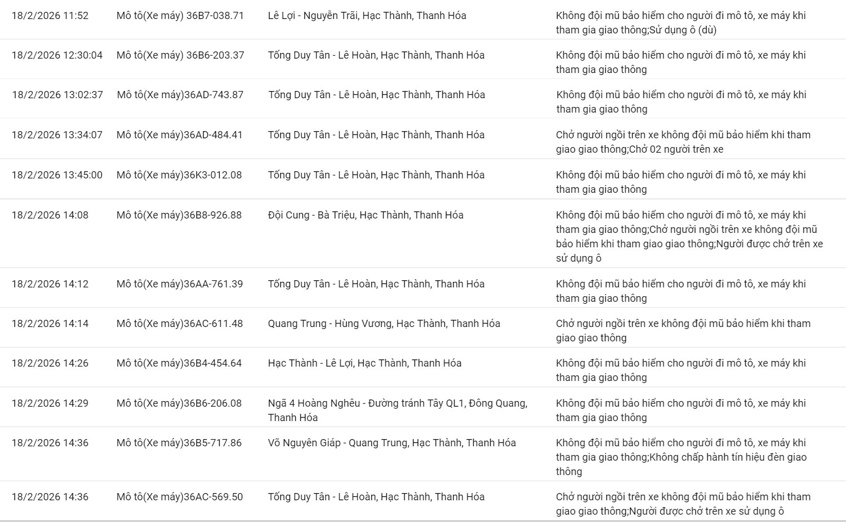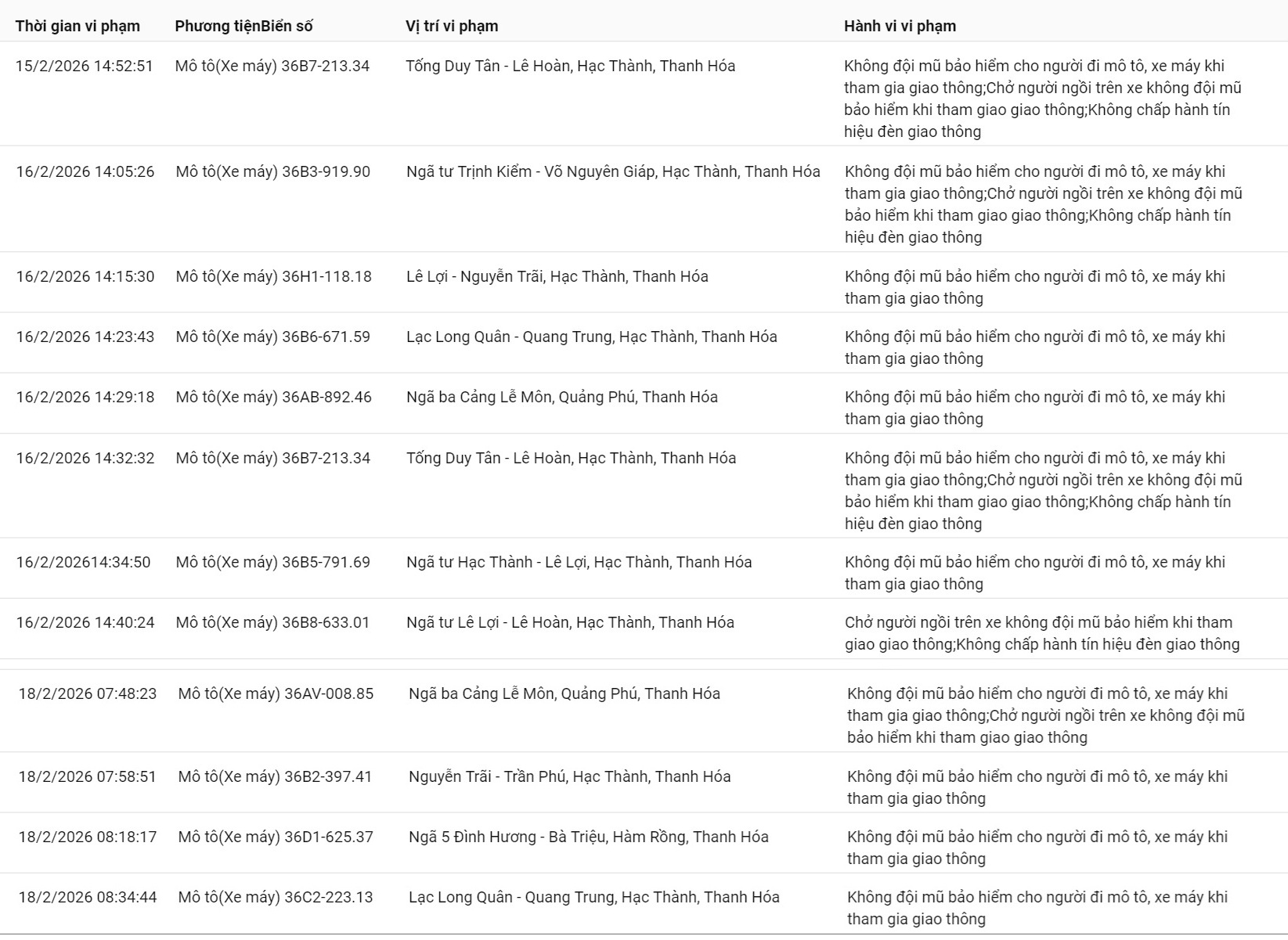 Công an tỉnh Thanh Hóa thông báo, từ ngày 15/02/2026 đến ngày 20/02/2026, thông qua thiết bị kỹ thuật nghiệp vụ, các tổ công tác của phòng CSGT đã phát hiện, ghi nhận bằng hình ảnh tổng cộng 44 trường hợp mô tô/xe máy không chấp hành đúng các quy định về TTATGT đường bộ. Danh sách biển số vi phạm cụ thể như sau: