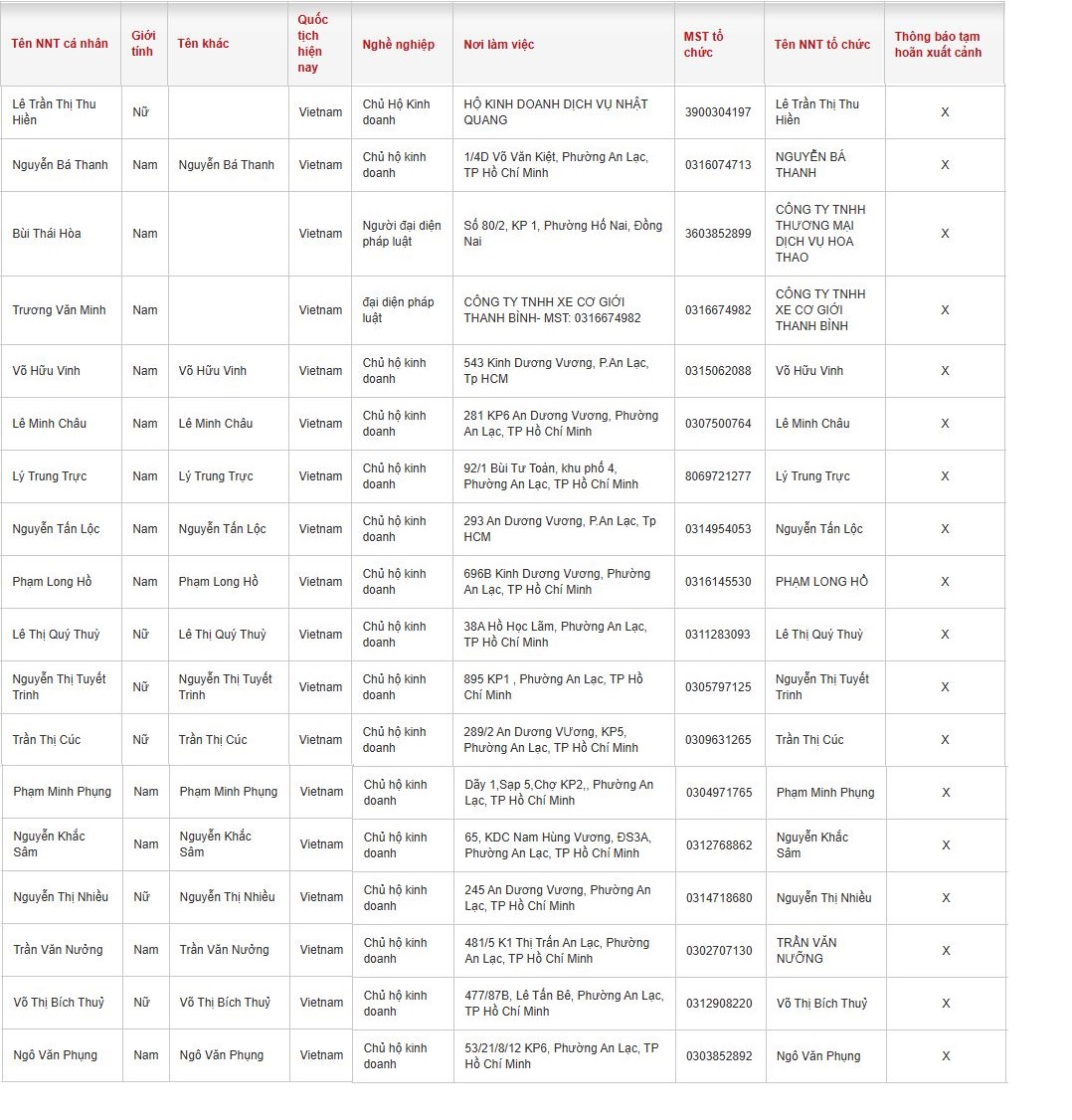 Danh sách người nộp thuế bị thông báo tạm hoãn xuất cảnh gồm: