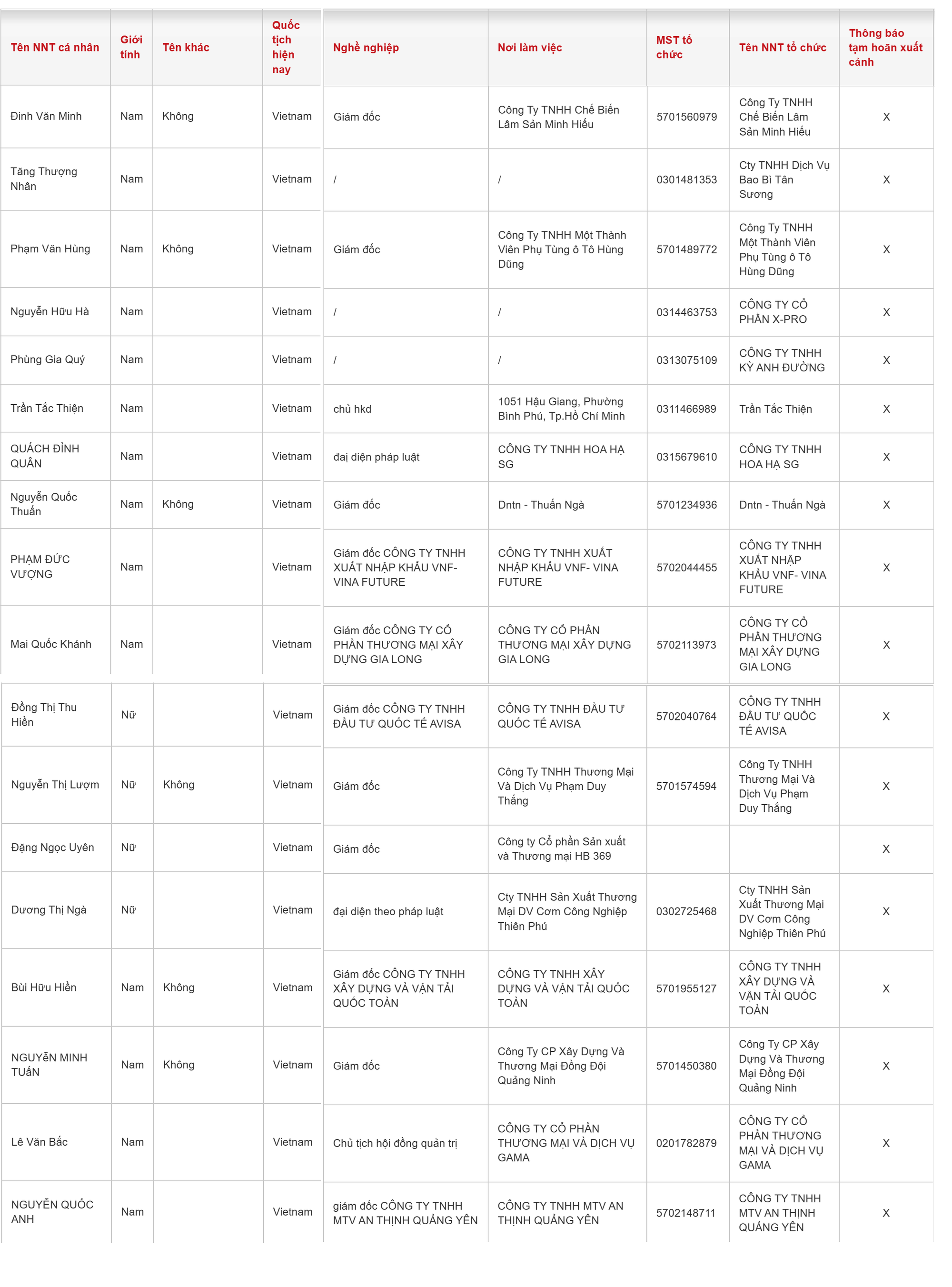 Danh sách người nộp thuế bị thông báo tạm hoãn xuất cảnh gồm: