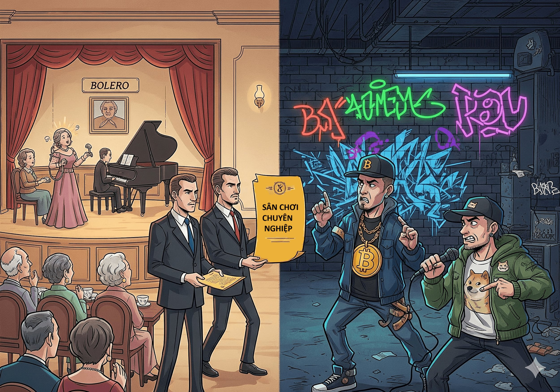 Cứ ngỡ các 'đại gia' VIX và TCBS cả đời chỉ chung thủy với những bản Bolero du dương của thị trường chứng khoán, ai ngờhọ đang xắn tay áo xây hẳn một sân khấu Rap Việt cho giới crypto.