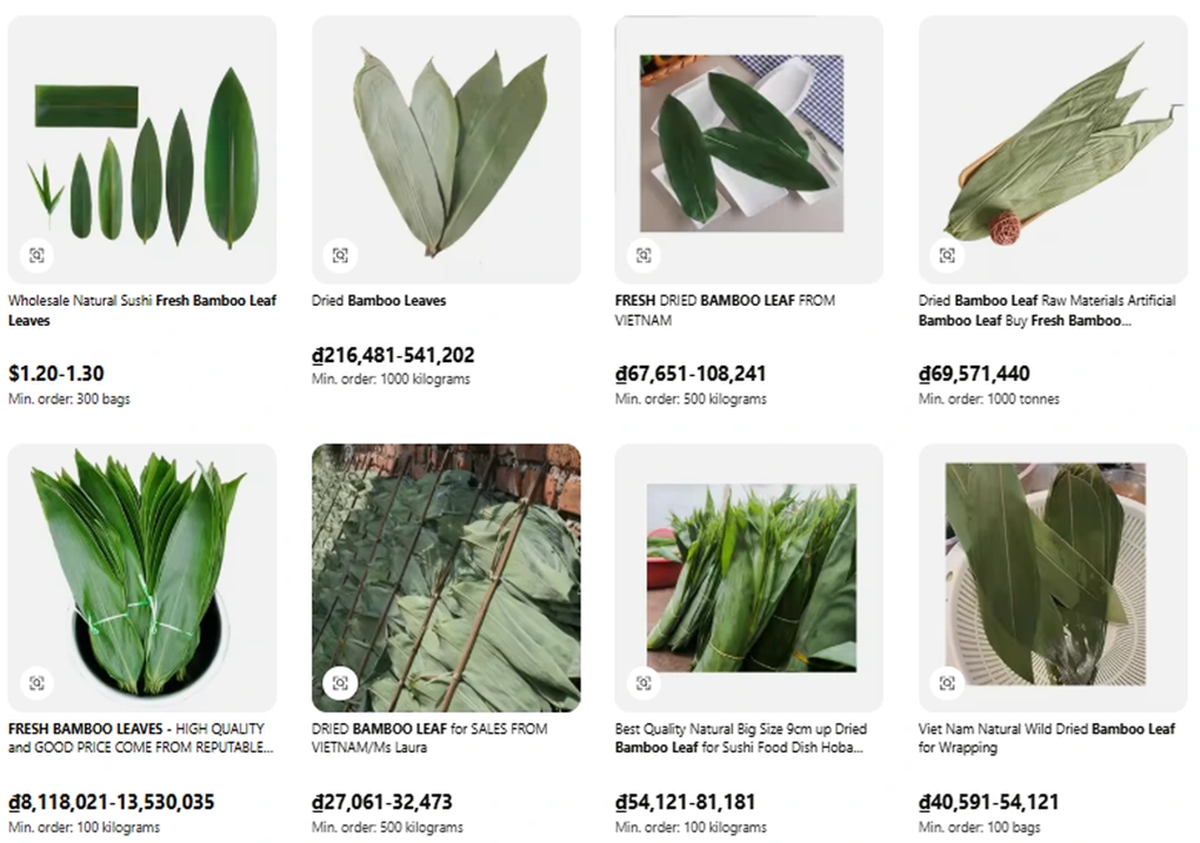 Đáng chú ý tên các sàn thương mại điện tử quốc tế như Alibaba, lá tre được chào bán với mức giá khá đa dạng. Với đơn hàng số lượng lớn từ vài trăm kg, giá lá tre tươi hoặc khô phổ biến khoảng 1-5 USD/kg (26.000-132.000 đồng/kg), tùy chủng loại và quy mô đặt mua. Một số sản phẩm bán lẻ hoặc loại đặc thù có giá cao hơn, dao động 6-7 USD/kg (157.000-185.000 đồng/kg), thậm chí 10 USD/kg (263.000 đồng/kg).