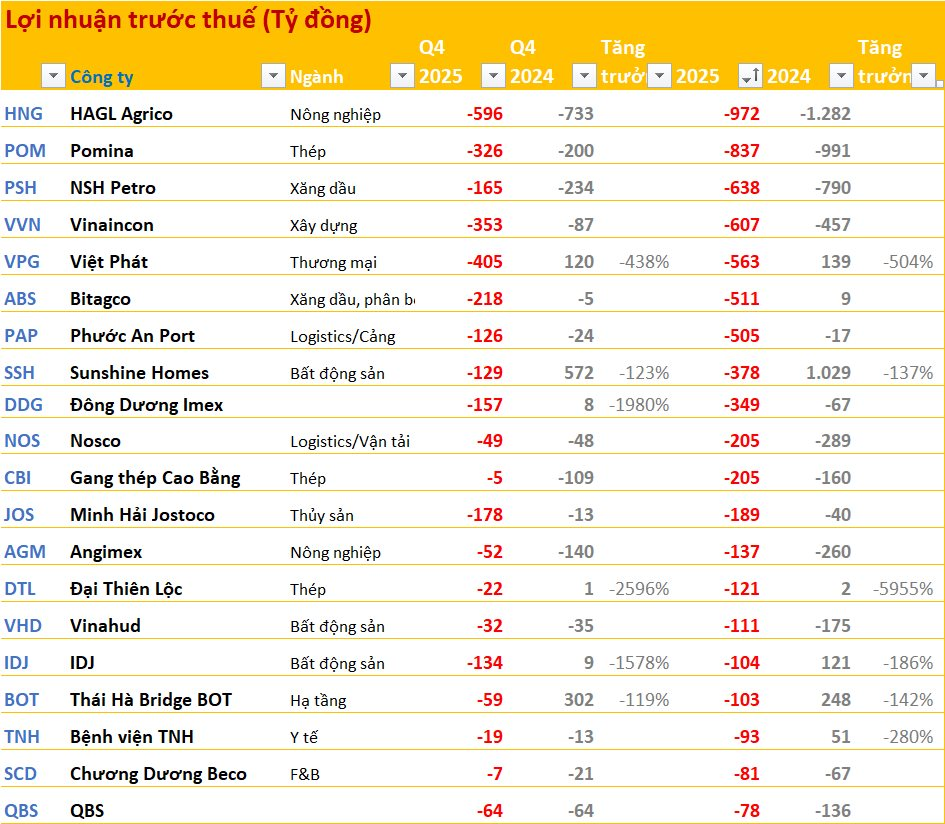 20 doanh nghiệp lỗ trước thuế lớn nhất năm 2025: HAGL Agrico lỗ gần 1.000 tỷ, bất động sản, logistics chiếm sóng