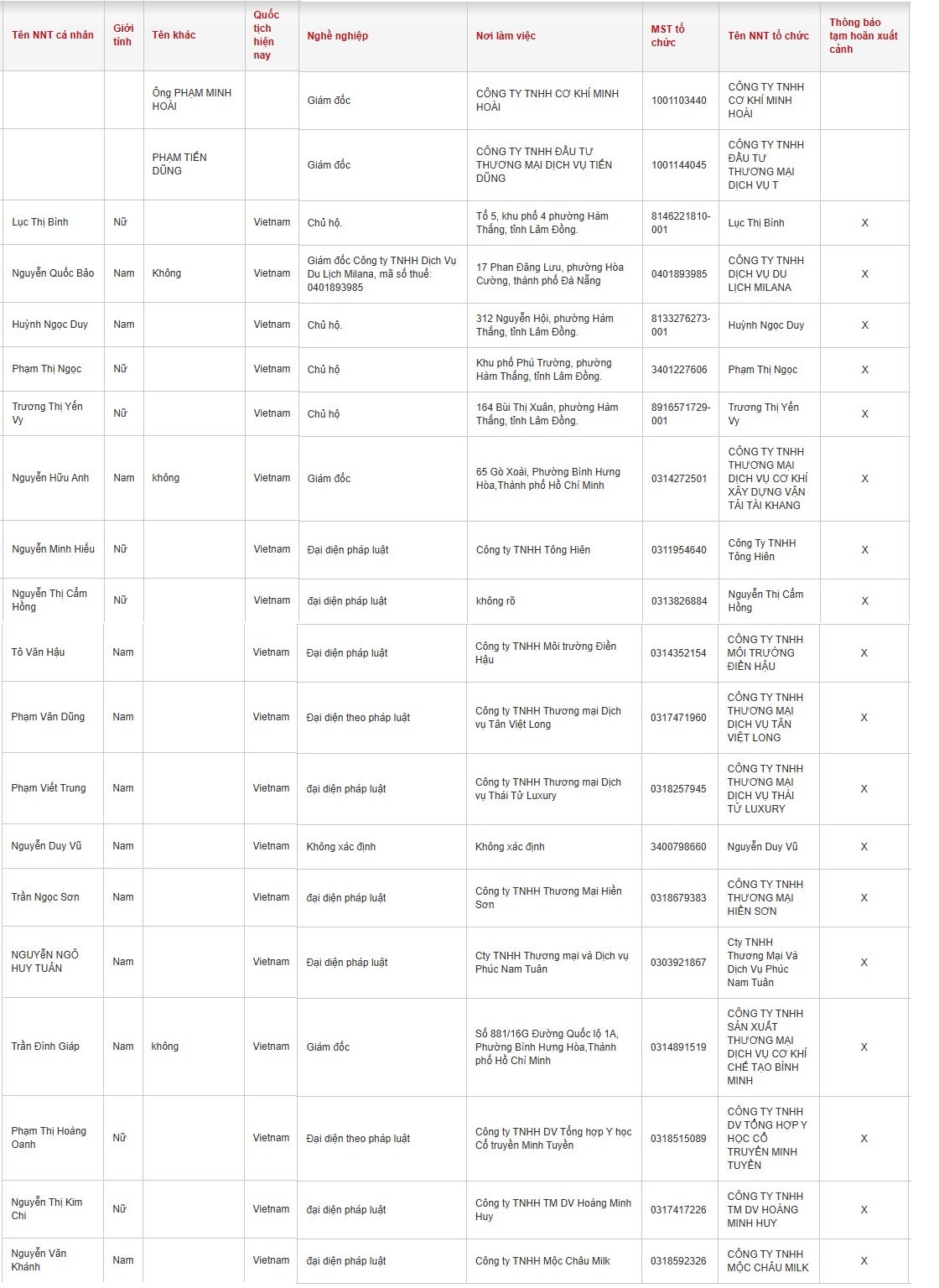 Danh sách các chủ doanh nghiệp bị thông báo tạm hoãn xuất cảnh gồm: