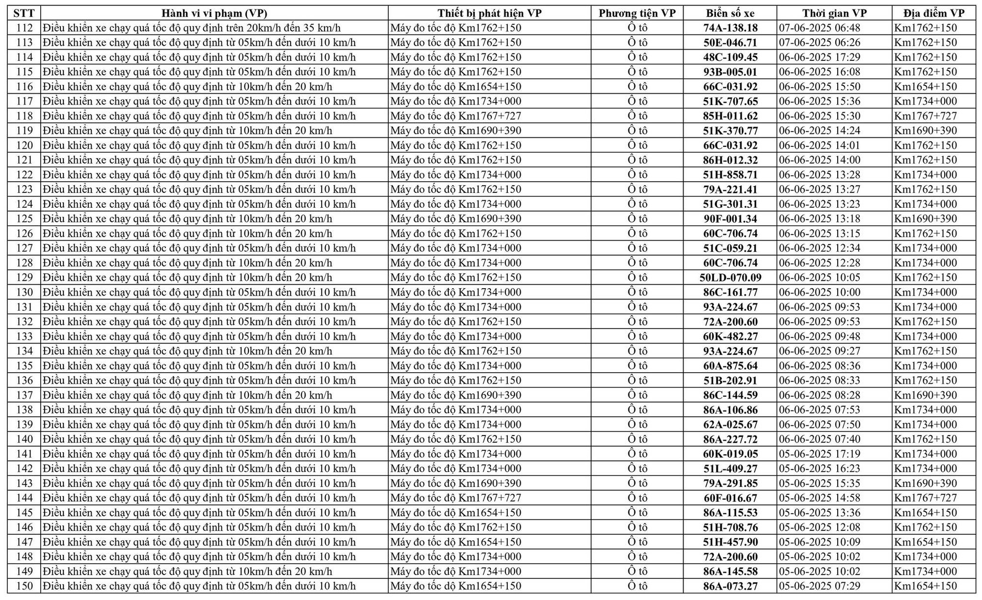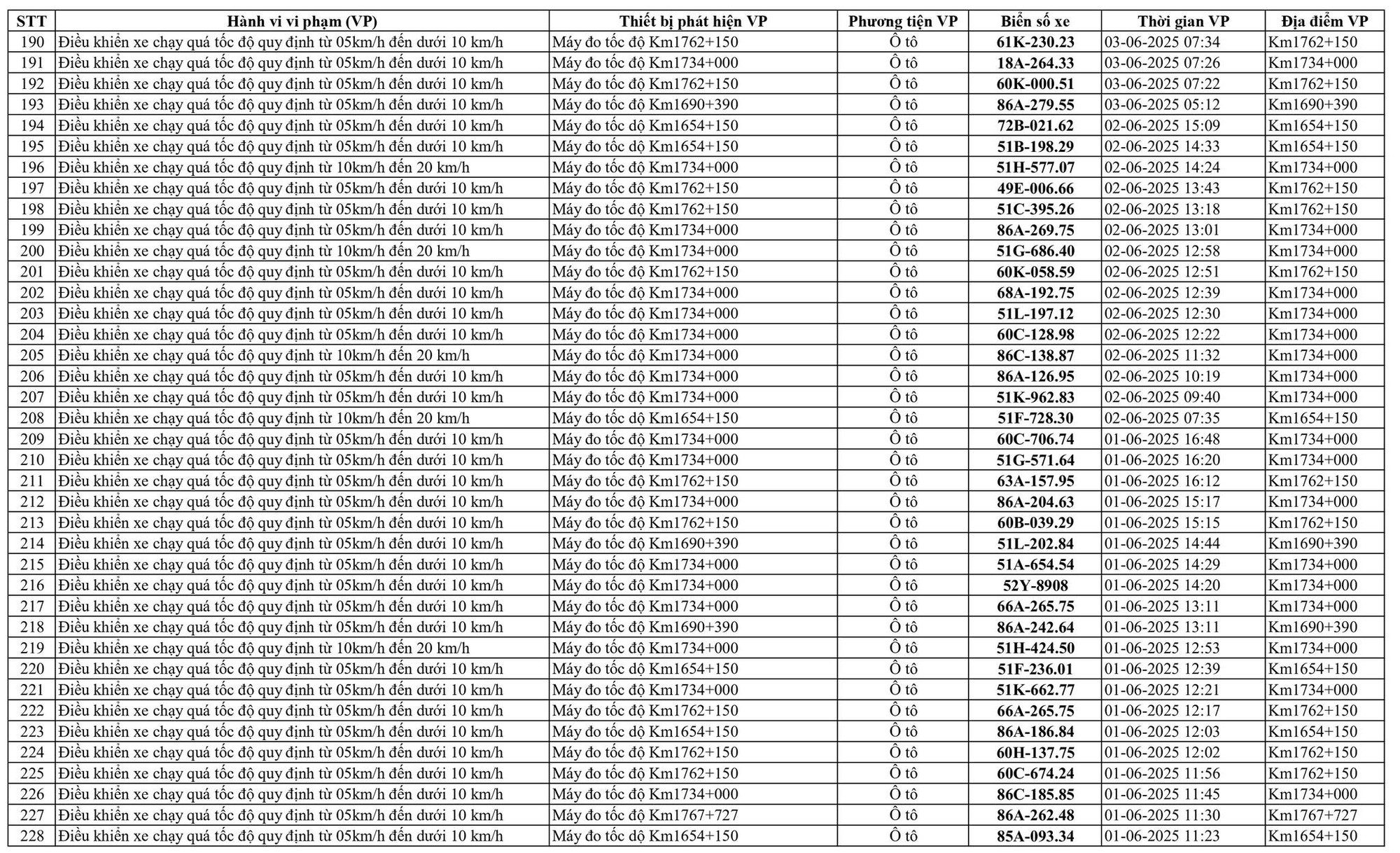 Theo thông báo mới nhất của Phòng Cảnh sát giao thông Công an tỉnh Bình Thuận, từ ngày 31/5/2025 đến ngày 14/6/2025, đã phát hiện 258 trường hợp vi phạm trật tự an toàn giao thông trên tuyến Quốc lộ 1A qua địa bàn tỉnh Bình Thuận thông qua hệ thống camera giám sát giao thông và phương tiện thiết bị kỹ thuật nghiệp vụ. Danh sách biển số vi phạm cụ thể như sau:
