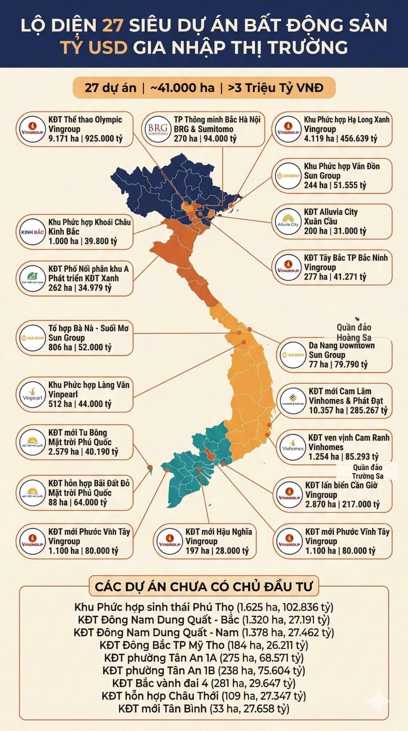 27 siêu dự án tỷ USD, tổng VĐT hơn 3 triệu tỷ đồng gia nhập thị trường: Vingroup và Sun Group chiếm hơn 1 nửa
