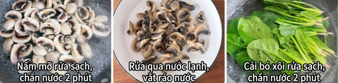 Bước 1: Loại bỏ rễ rau cải bó xôi, rửa sạch và cắt nhỏ; băm nhỏ tỏi và gừng; trộn bột bắp với một ít nước để tạo thành hỗn hợp bột bắp sền sệt. Đun sôi nước trong nồi, cho rau bina vào, thêm nửa thìa cà phê dầu ăn để giữ màu, chần trong khoảng 1 phút, vớt ra và thả vào nước lạnh để làm nguội, sau đó vớt ra để ráo rồi thái nhỏ.