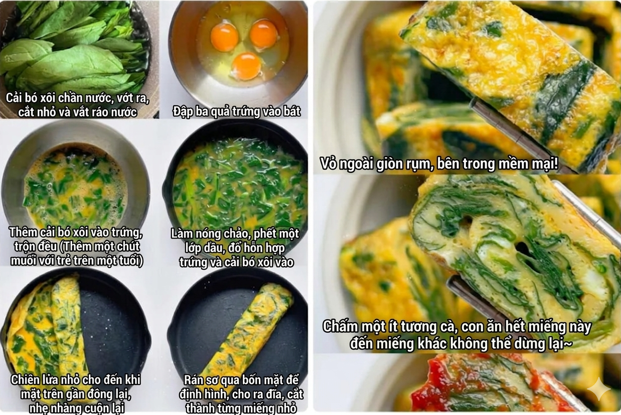 Chúng ta thường muốn chuẩn bị bữa sáng bổ dưỡng cho con cái, nhưng lại ngại công đoạn chế biến cầu kỳ. Bạn nhất định phải thử món trứng cuộn rau cải bó xôi này! Món này rất dễ làm, có kết cấu mềm mại, và là nguồn cung cấp canxi và kẽm tuyệt vời, giúp tăng gấp đôi giá trị dinh dưỡng. Con tôi luôn ăn hết cuốn này đến cuốn khác mà không hề kén chọn. Món này cũng cung cấp nhiều axit folic và vitamin. Hơn nữa, trông nó rất ngon và hấp dẫn!