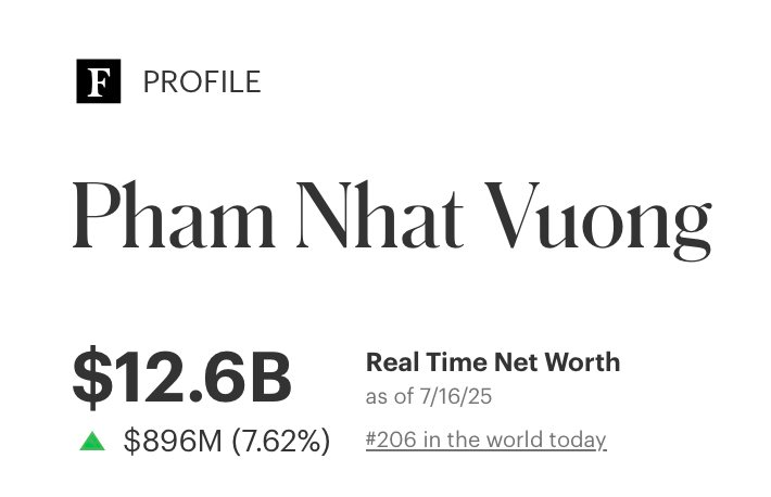 Cổ phiếu VIC tăng mạnh, tài sản trên sàn chứng khoán cũng tăng vọt. Ước tính khối tài sản của Chủ tịch Vingroup lên đến 270.000 tỷ đồng. Còn theo cập nhật từ Forbes, tại ngày 16/7, ông Phạm Nhật Vượng là người giàu thứ 206 thế giới với khối tài sản 12,6 tỷ USD.
