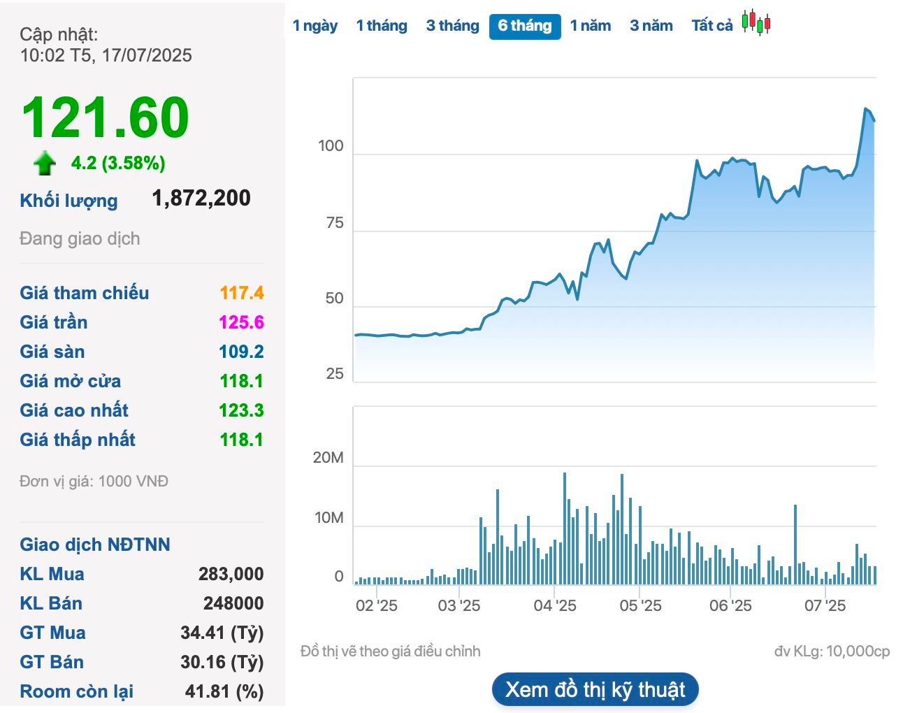 Cổ phiếu Vingroup (VIC) đang tạo nên cơn sốt thực sự trên sàn chứng khoán. Liên tục tăng mạnh, thị giá VIC có thời điểm đã vượt 123.000 đồng/cp trong phiên 17/7. Với mức giá này, 1 nghìn cổ phiếu VIC có giá khoảng 123 triệu đồng, hơn 1 cây vàng SJC (120,6 triệu đồng - bán ra).