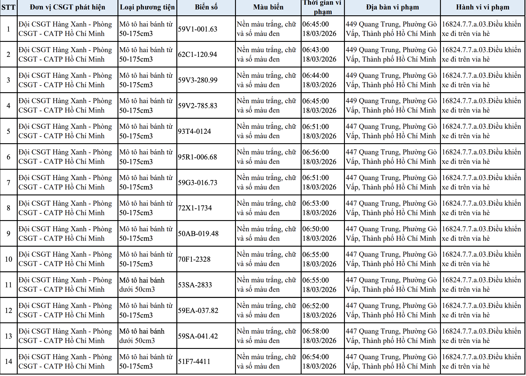 Danh sách các phương tiện vi phạm tại TP.HCM như sau: