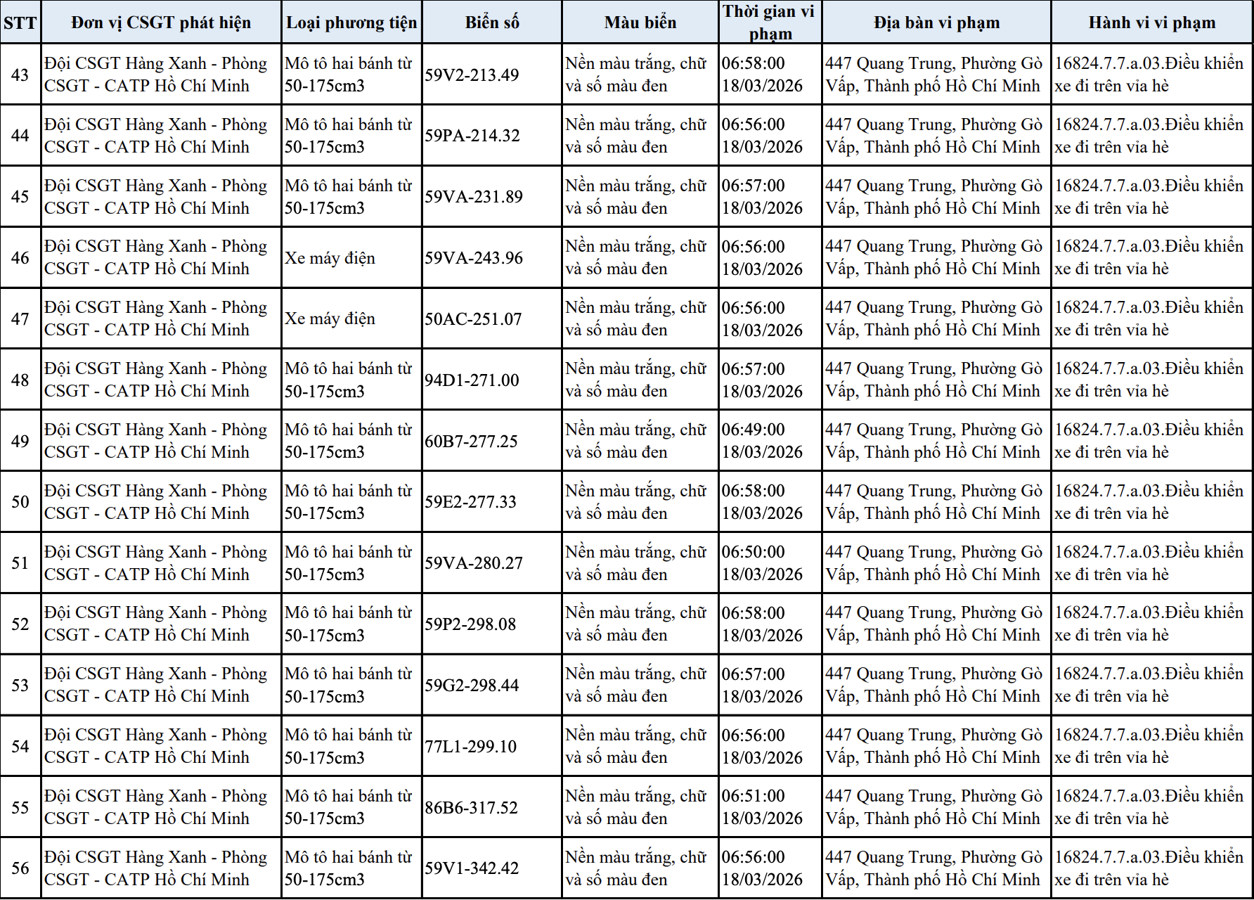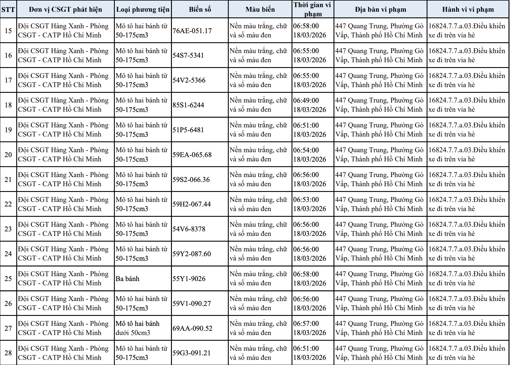 Tại TP.HCM, ngày 23/3, Đội CSGT Hàng Xanh (thuộc Phòng CSGT PC08, Công an TP.HCM) cho biết đơn vị đã ghi nhận và gửi thông báo vi phạm đến 103 trường hợp người điều khiển xe máy chạy lên vỉa hè trên tuyến đường Quang Trung, phường Gò Vấp.