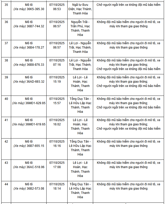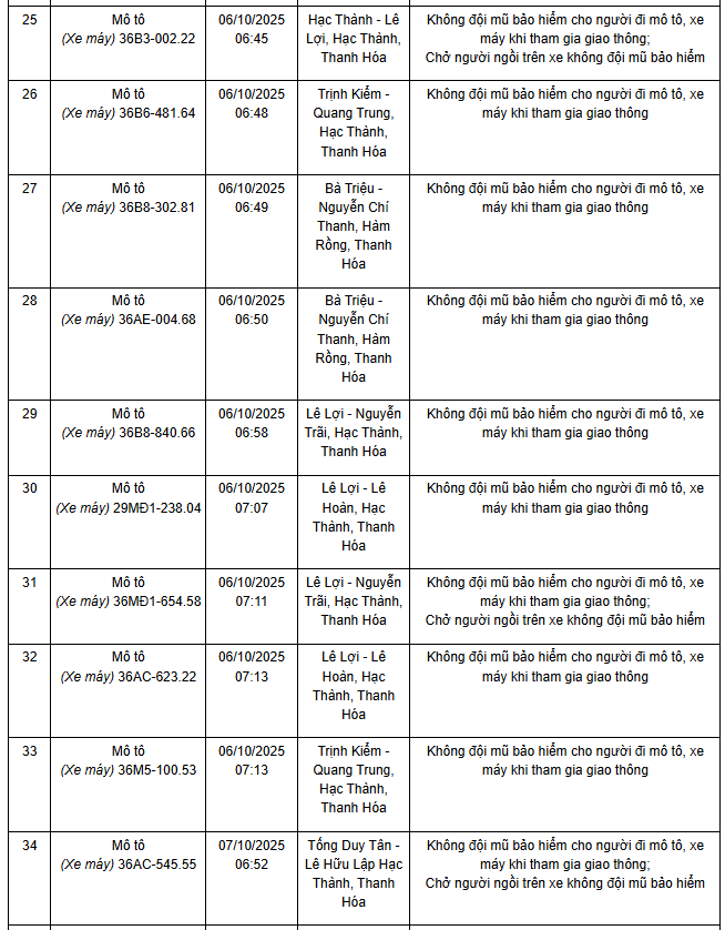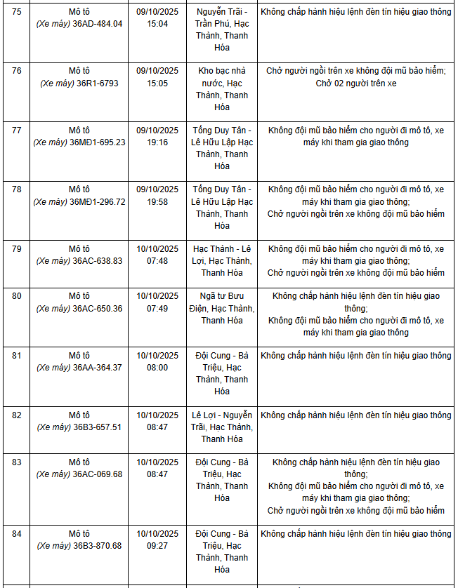 Mới đây, Phòng Cảnh sát giao thông, Công an tỉnh Thanh Hoá thông báo các phương tiện vi phạm về trật tự an toàn giao thông đường bộ được phát hiện qua Hệ thống camera giám sát an ninh, trật tự và an toàn giao thông trên địa bàn từ ngày 06/10/2025 đến ngày 10/10/2025. Trong đó, có 77 trường hợp xe máy vi phạm.
