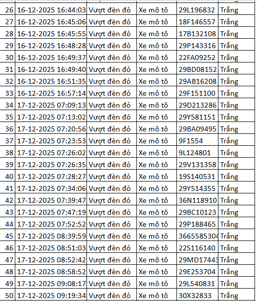 Từ 12h00’ ngày 15/12/2025 đến 12h00’ ngày 16/12/2025, qua trích xuất dữ liệu từ camera A.I được thí điểm lắp đặt tại nội đô Hà Nội (nút giao phố Phạm Văn Bạch - Hoàng Quán Chi), đã tự động phát hiện 65 trường hợp không chấp hành hiệu lệnh của đèn tín hiệu - vượt đèn đỏ (mô tô, xe gắn máy).