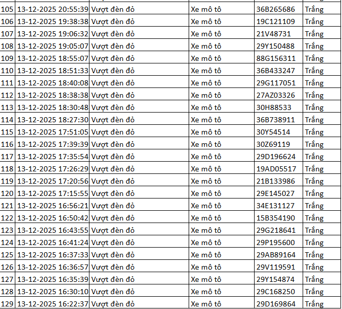 Từ 12h00’ ngày 13/12/2025 đến 12h00’ ngày 14/12/2025, Qua trích xuất dữ liệu từ camera A.I được thí điểm lắp đặt tại nội đô Hà Nội (nút giao phố Phạm Văn Bạch - Hoàng Quán Chi), đã tự động phát hiện 124 trường hợp không chấp hành hiệu lệnh của đèn tín hiệu - vượt đèn đỏ (mô tô, xe gắn máy).