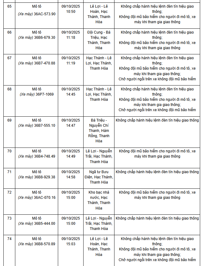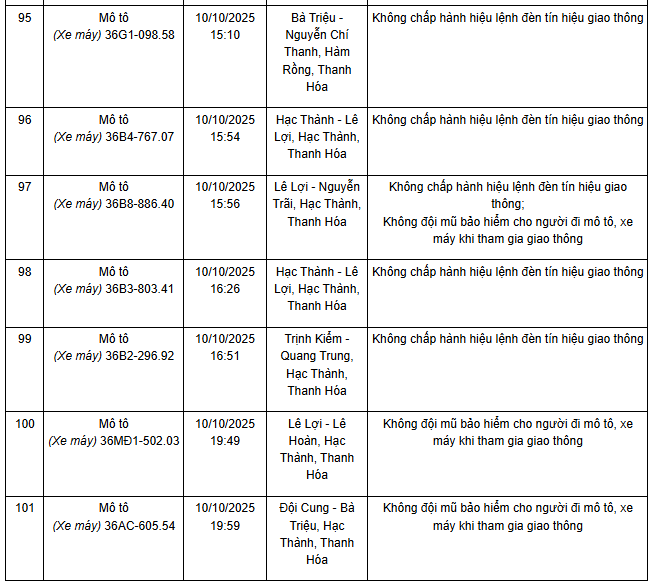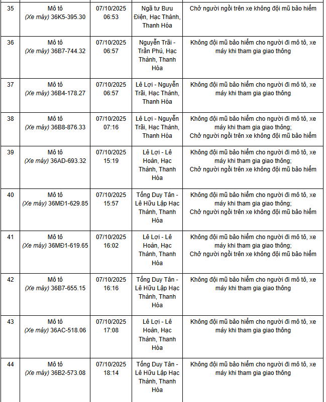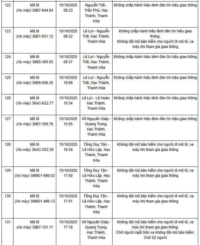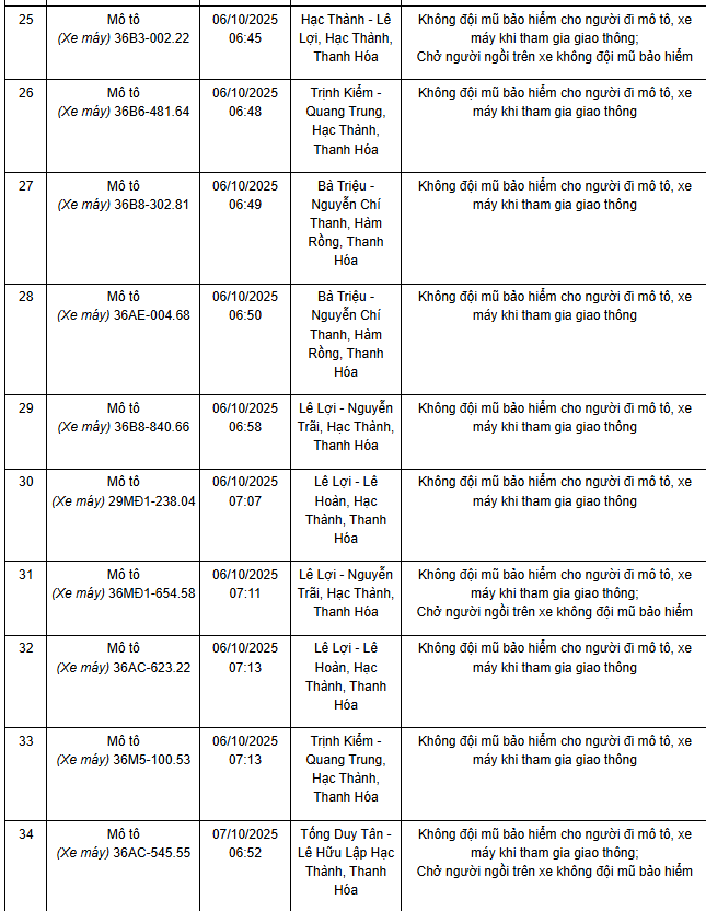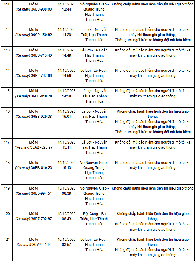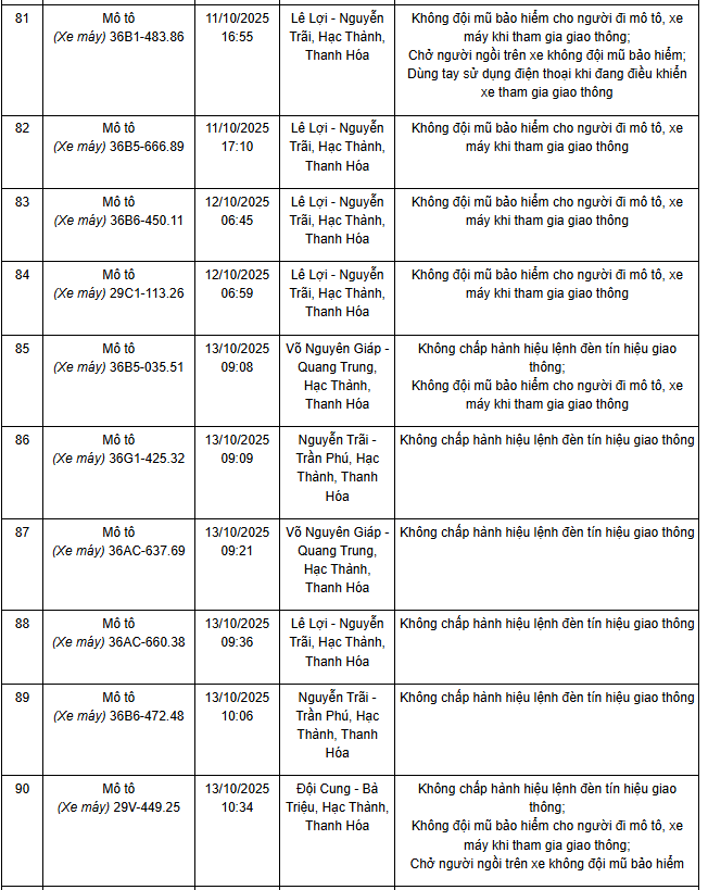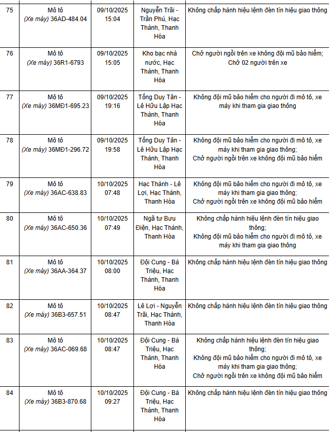 Trước đó, Phòng Cảnh sát giao thông, Công an tỉnh Thanh Hoá thông báo các phương tiện vi phạm về trật tự an toàn giao thông đường bộ được phát hiện qua Hệ thống camera giám sát an ninh, trật tự và an toàn giao thông trên địa bàn từ ngày 06/10/2025 đến ngày 10/10/2025. Trong đó, có 77 trường hợp xe máy vi phạm.