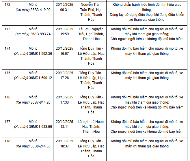 Ngày 16/11, Phòng Cảnh sát giao thông, Công an tỉnh Thanh Hoá thông báo các phương tiện vi phạm về TTATGT đường bộ được phát hiện qua Hệ thống camera giám sát an ninh, trật tự và an toàn giao thông trên địa bàn từ ngày 11/10/2025 đến ngày 20/10/2025.
