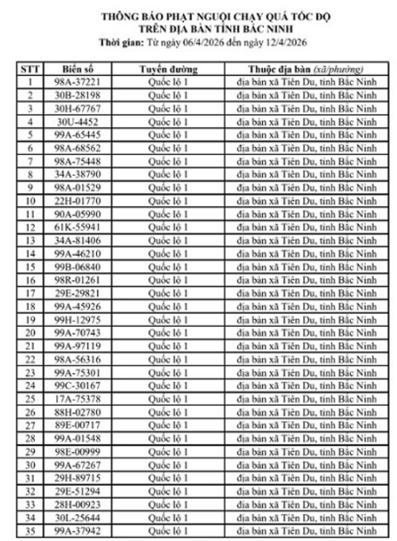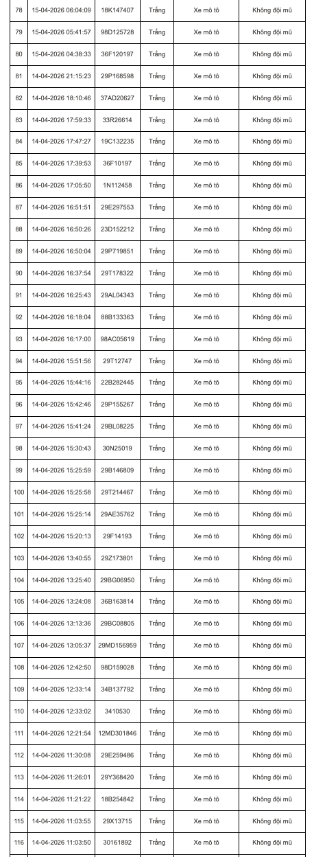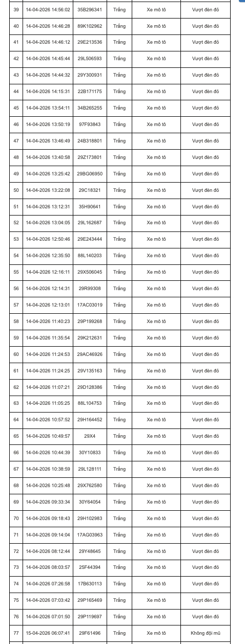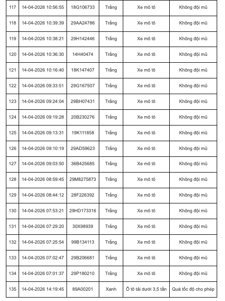 Tại Hà Nội, trong khoảng thời gian từ 7h30 ngày 14/4 đến 7h30 ngày 15/4, hệ thống camera AI trên cao tốc Nội Bài - Lào Cai và các nút giao nội đô đã phát hiện 135 trường hợp vi phạm. Các lỗi chủ yếu bao gồm: vượt đèn đỏ, không đội mũ bảo hiểm khi tham gia giao thông hay chạy quá tốc độ cho phép.
