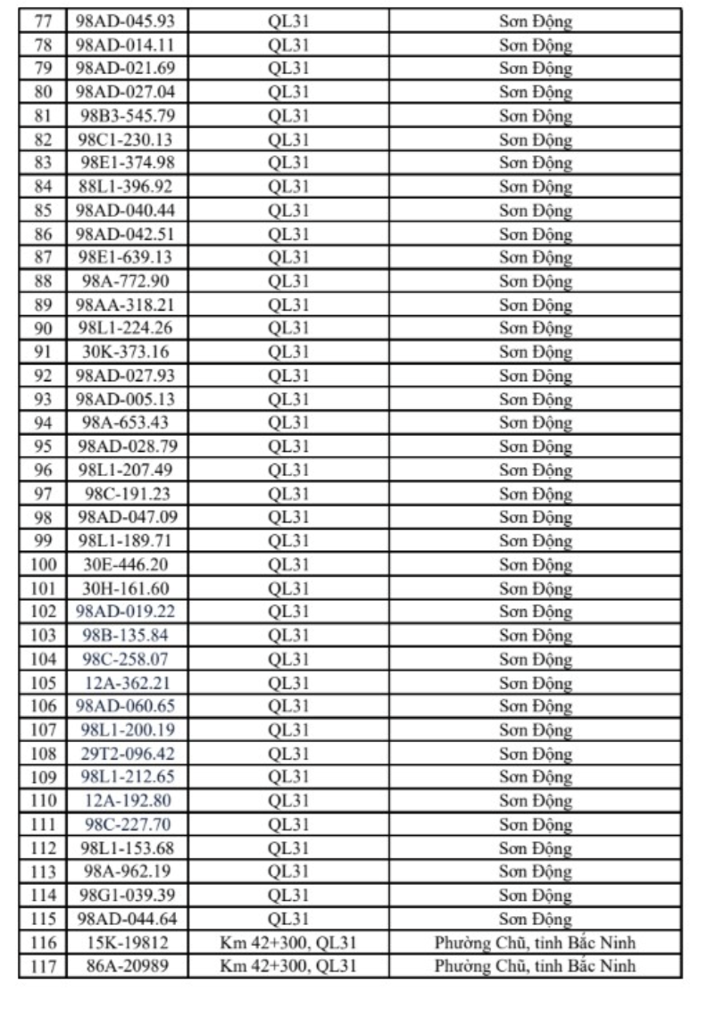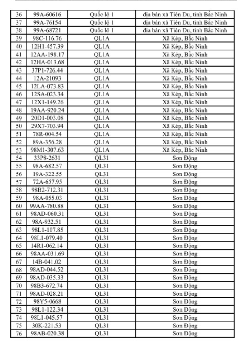 Danh sách phương tiện vi phạm như sau: