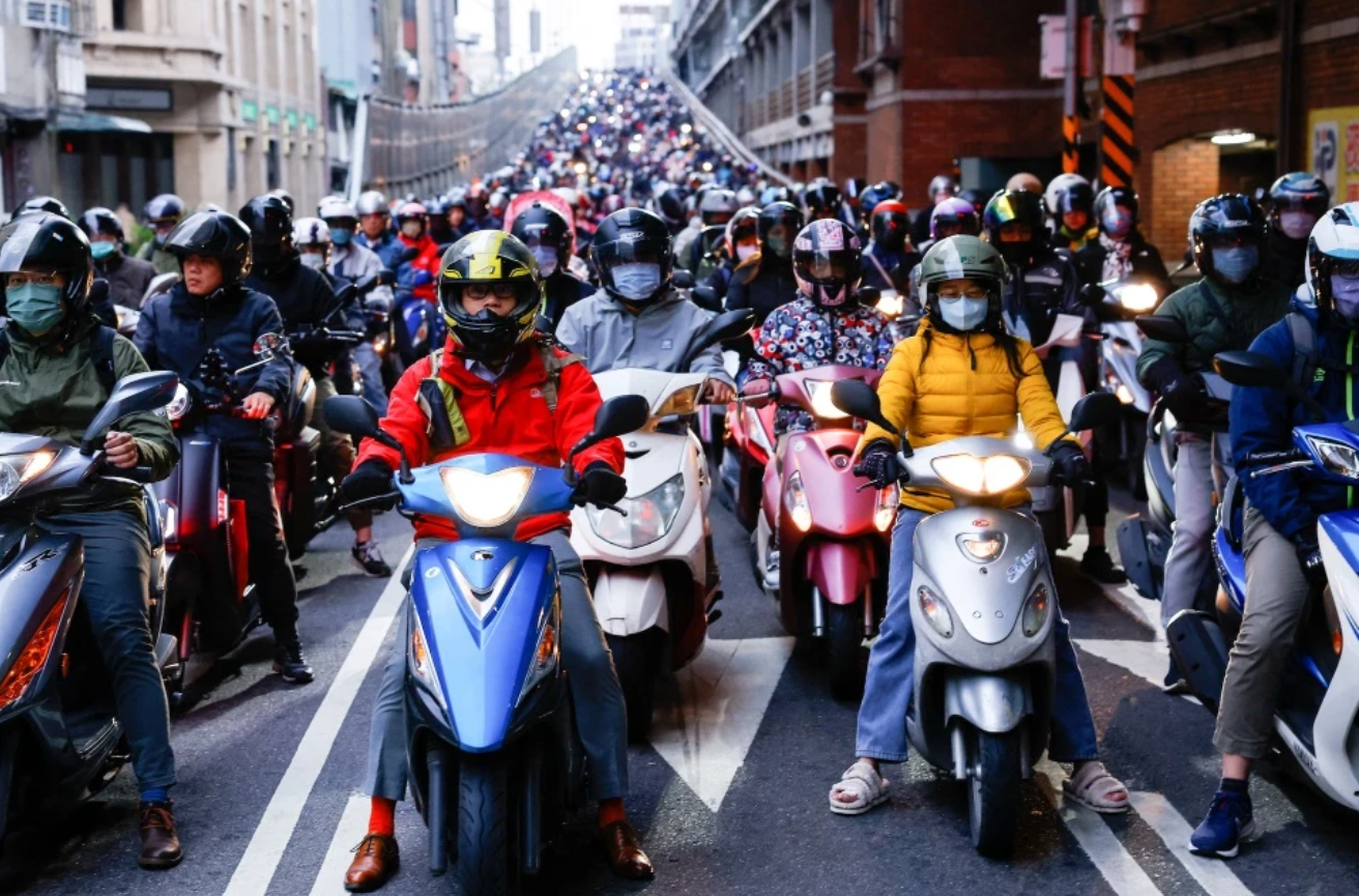 Người đi xe máy chờ đèn giao thông vào giờ cao điểm buổi sáng ở Đài Bắc, Đài Loan. Ảnh: Reuters