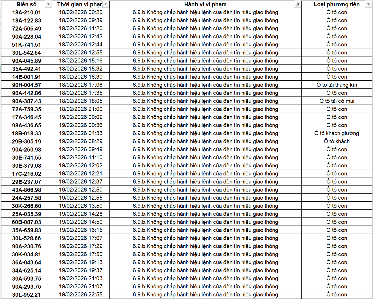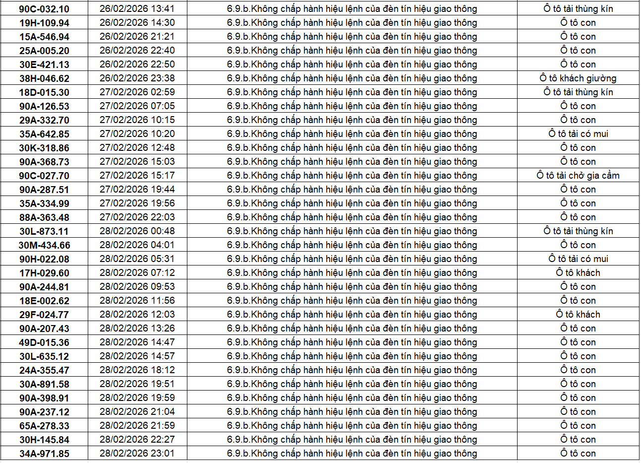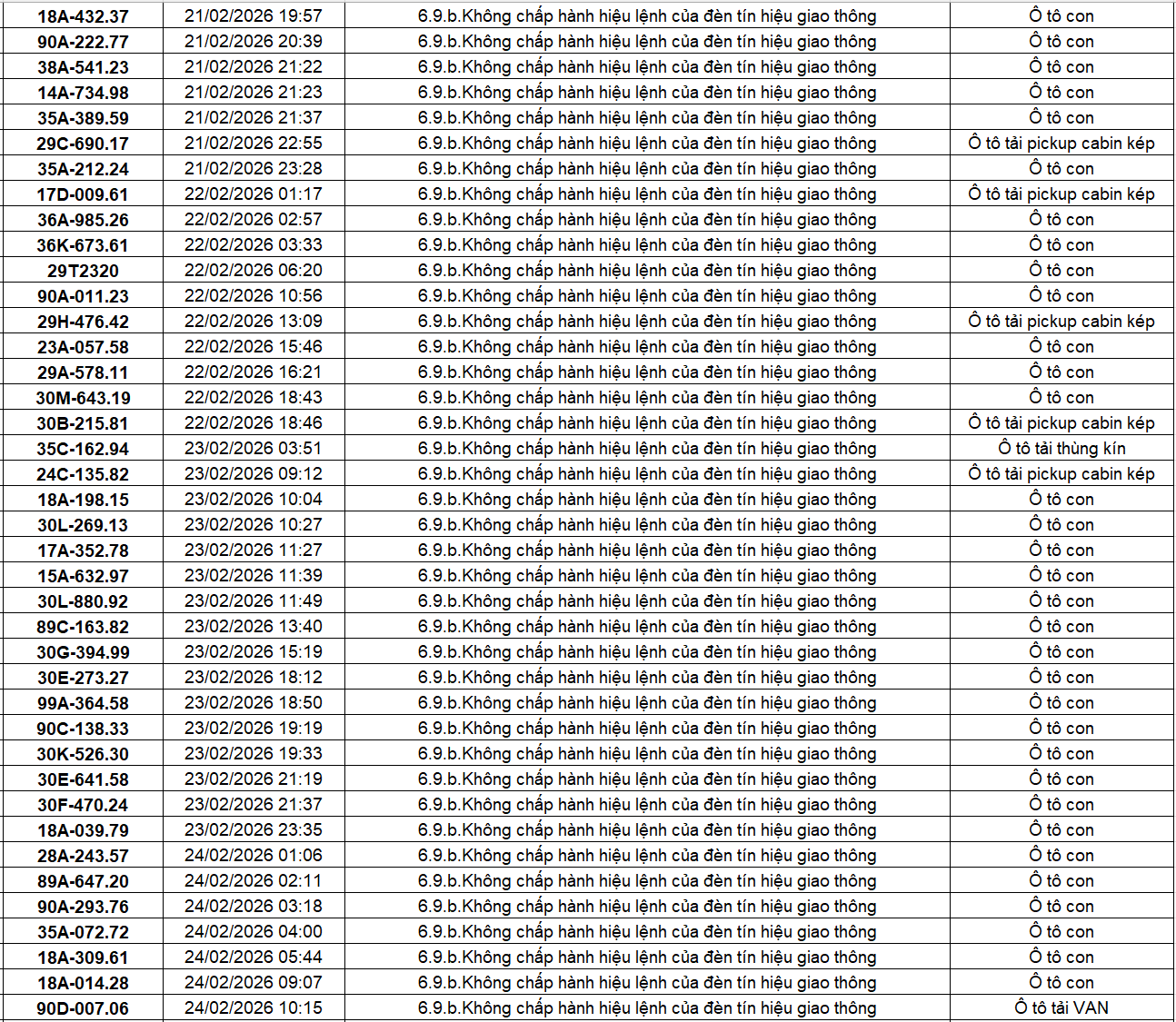 Theo thông báo của Phòng Cảnh sát giao thông Công an tỉnh Ninh Bình, từ ngày 18/2/2026 đến 28/2/2026 đã phát hiện 434 trường hợp phương tiện vi phạm trật tự an toàn giao thông qua hệ thống camera giám sát giao thông và phương tiện thiết bị kỹ thuật nghiệp vụ. Trong đó, lỗi vi phạm phổ biến nhất là không chấp hành hiệu lệnh của đèn tín hiệu giao thông với 186 trường hợp. Danh sách cụ thể như sau:
