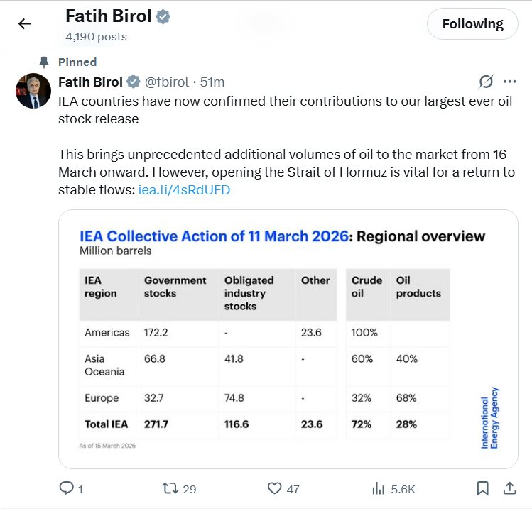 Giám đốc điều hành IEA Fatih Birol đã xác nhận trên mạng xã hội X rằng một lượng dầu bổ sung chưa từng có sẽ được đưa vào thị trường châu Á kể từ ngày 16/3.