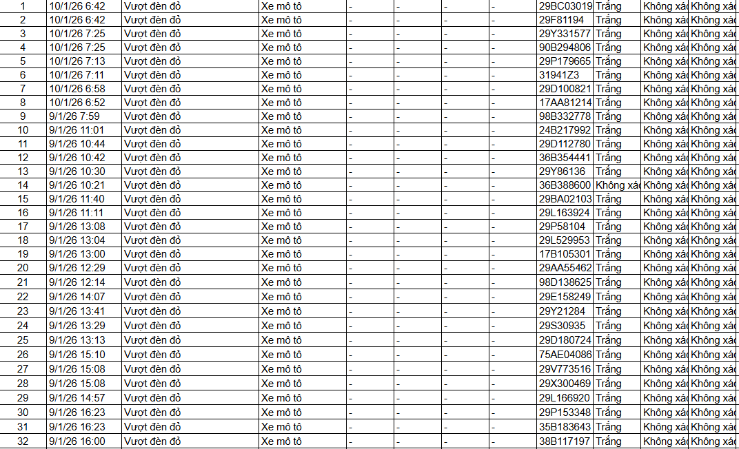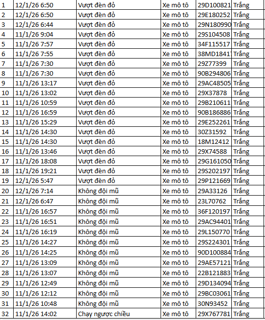 Từ 12h00’ ngày 11/1/2026 đến 12h00’ ngày 12/1/2026, đã tự động phát hiện 32 trường hợp xe máy vi phạm.