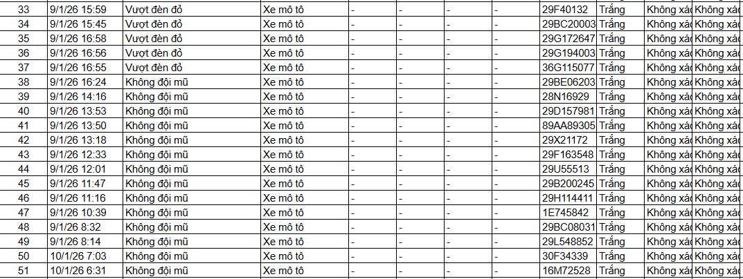 Từ 12h00’ ngày 10/1/2026 đến 12h00’ ngày 11/1/2026, đã tự động phát hiện 51 trường hợp xe máy vi phạm.