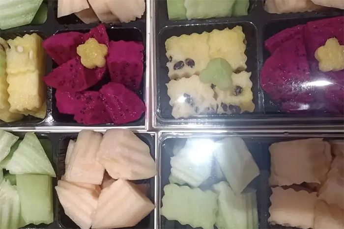 Có thể bạn không nhận ra rằng hoa quả trên khay thường là hỗn hợp của nhiều loại khác nhau; có thể được lấy từ những quả dập nát khó bán lẻ, hoặc bị héo, nhũn sau khi để vài ngày. Nhân viên siêu thị sẽ cắt bỏ vỏ và xếp chúng vào khay để bán.