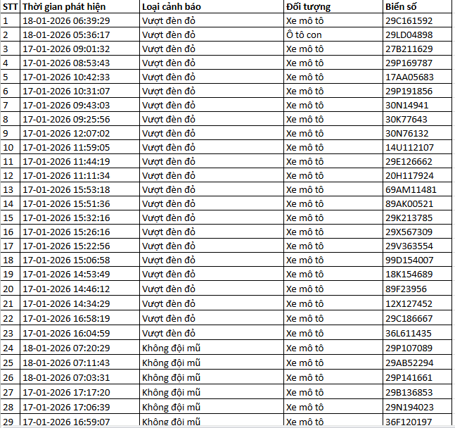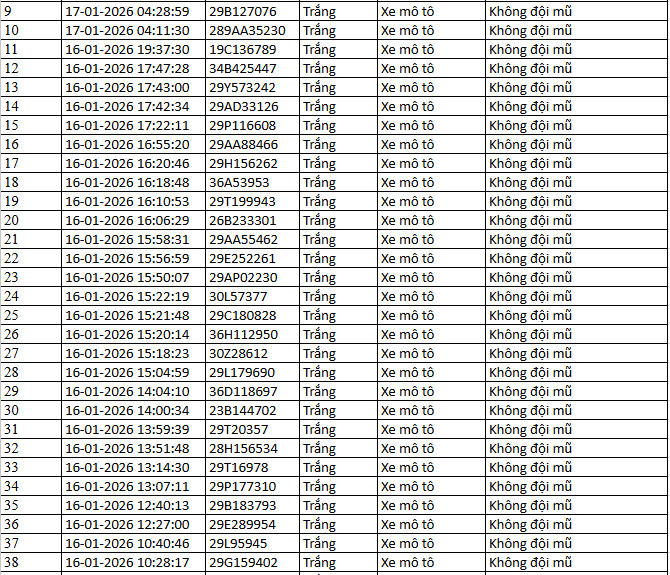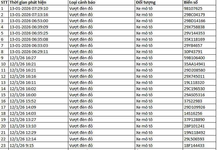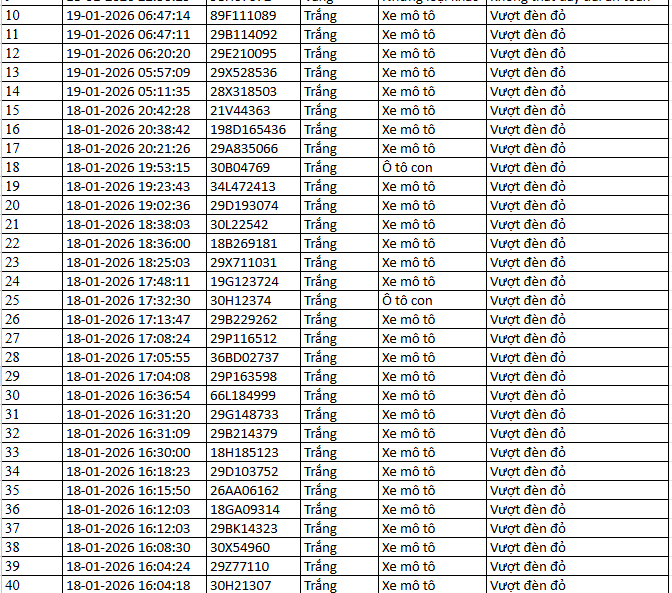 Từ 12h00’ ngày 12/1/2026 đến 12h00’ ngày 13/1/2026, đã tự động phát hiện 40 trường hợp xe máy vi phạm.