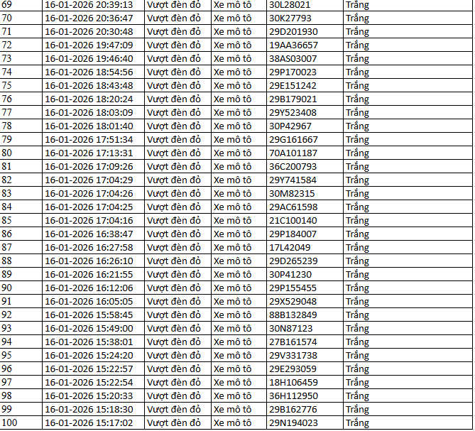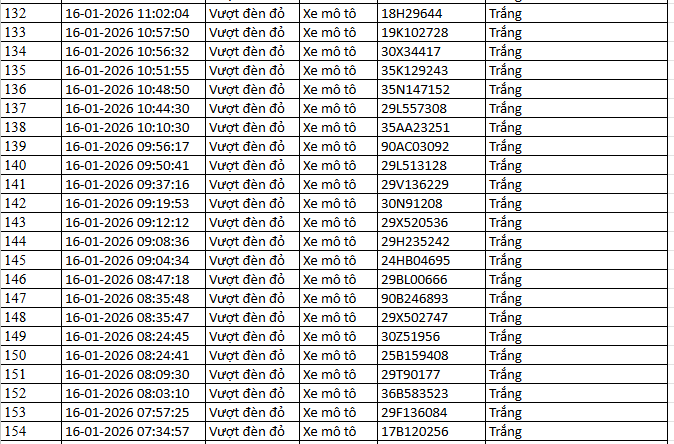 Từ 12h00’ ngày 16/1/2026 đến 12h00’ ngày 17/1/2026, đã tự động phát hiện 145 trường hợp xe máy vi phạm.