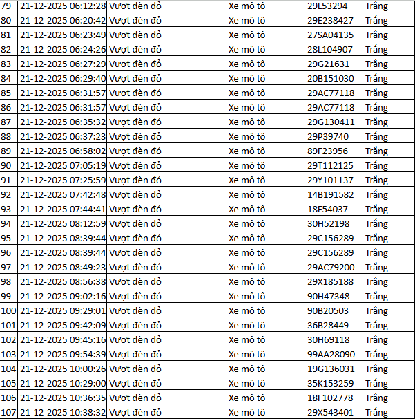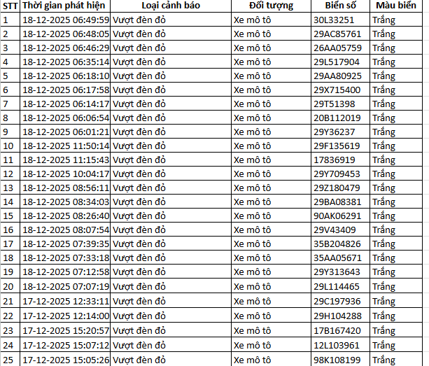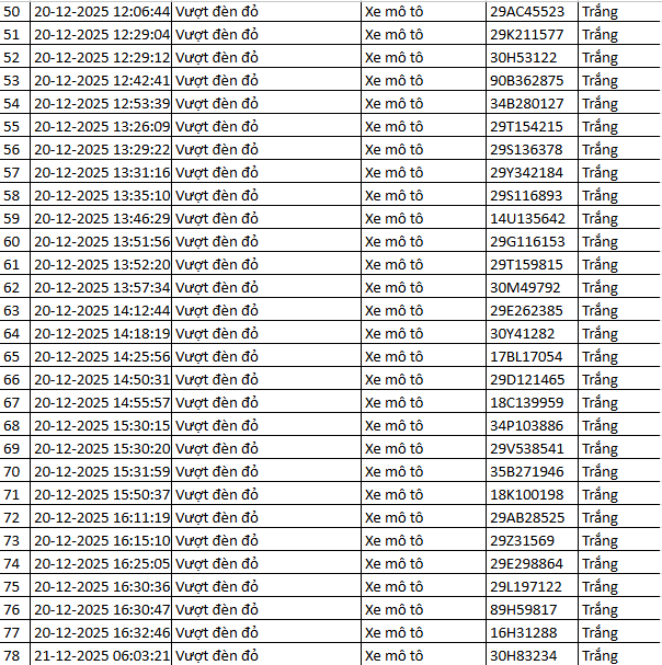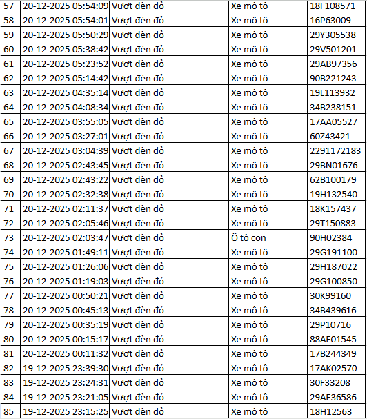 Từ 12h00’ ngày 20/12/2025 đến 12h00’ ngày 21/12/2025, đã tự động phát hiện 70 trường hợp xe máy, xe mô tô vượt đèn đỏ.