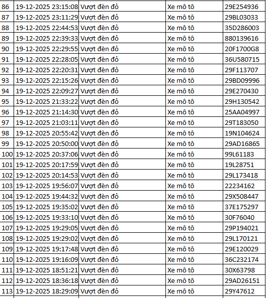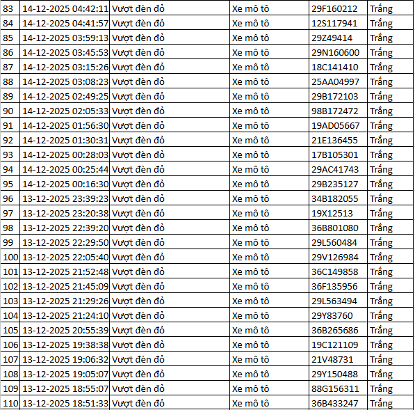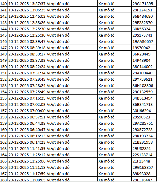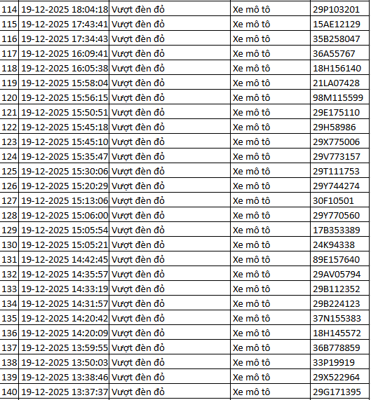 Từ 12h00’ ngày 19/12/2025 đến 12h00’ ngày 20/12/2025, đã tự động phát hiện 123 trường hợp xe máy, xe mô tô vượt đèn đỏ.