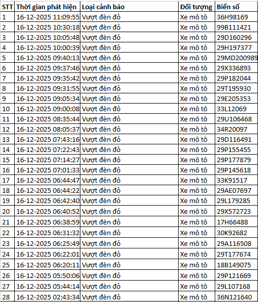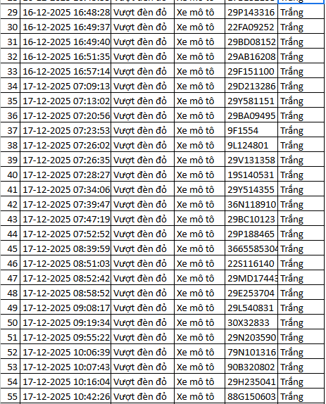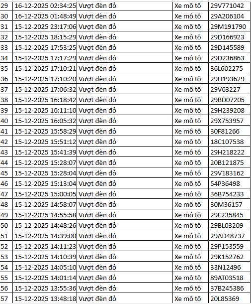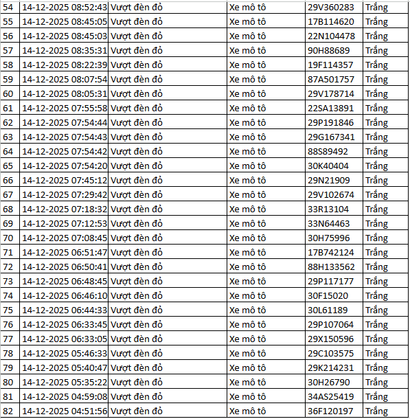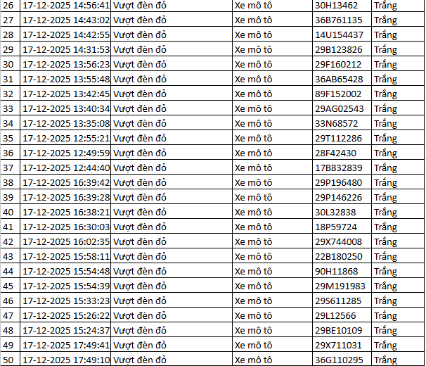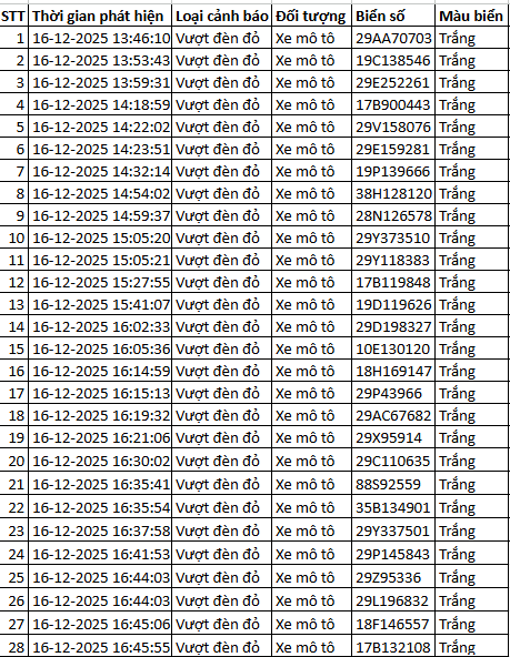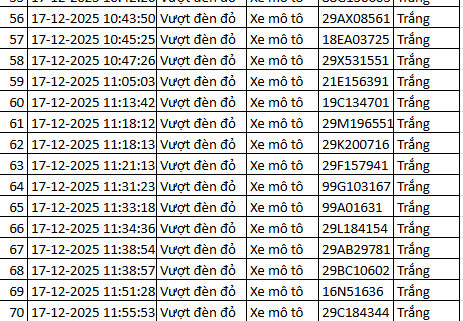Từ 12h00’ ngày 16/12/2025 đến 12h00’ ngày 17/12/2025, đã tự động phát hiện 70 trường hợp xe máy, xe mô tô vượt đèn đỏ