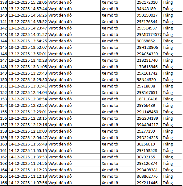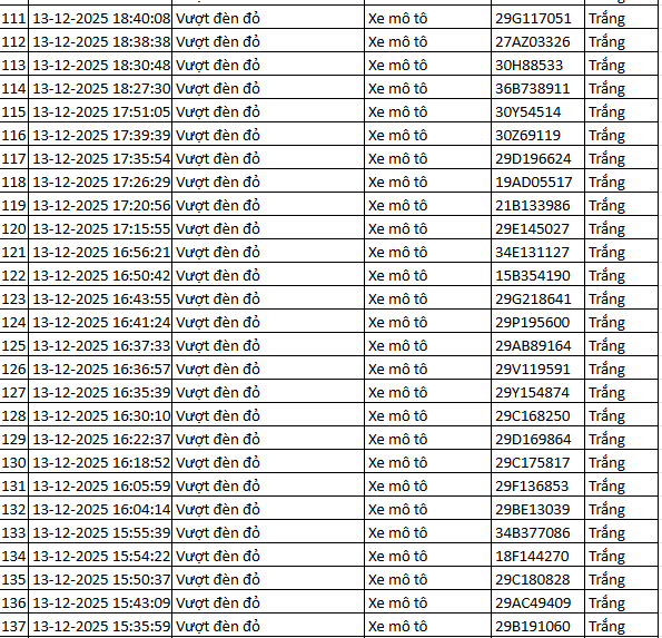 Từ 12h00’ ngày 13/12/2025 đến 12h00’ ngày 14/12/2025, đã tự động phát hiện 124 trường hợp xe máy, xe mô tô vượt đèn đỏ