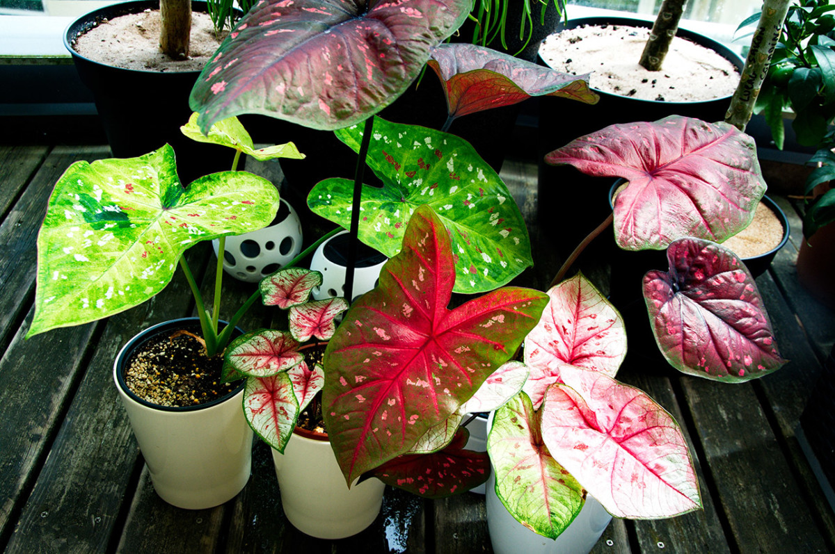 Môn kiểng (Caladium biccolor) có nguồn gốc Nam Mỹ, được ưa chuộng nhờ lá hình khiên, màu sắc bắt mắt, thường là trắng – xanh – đỏ pha trộn. Cây mọc từ thân củ dưới đất, dễ trồng và phù hợp trang trí phòng khách.