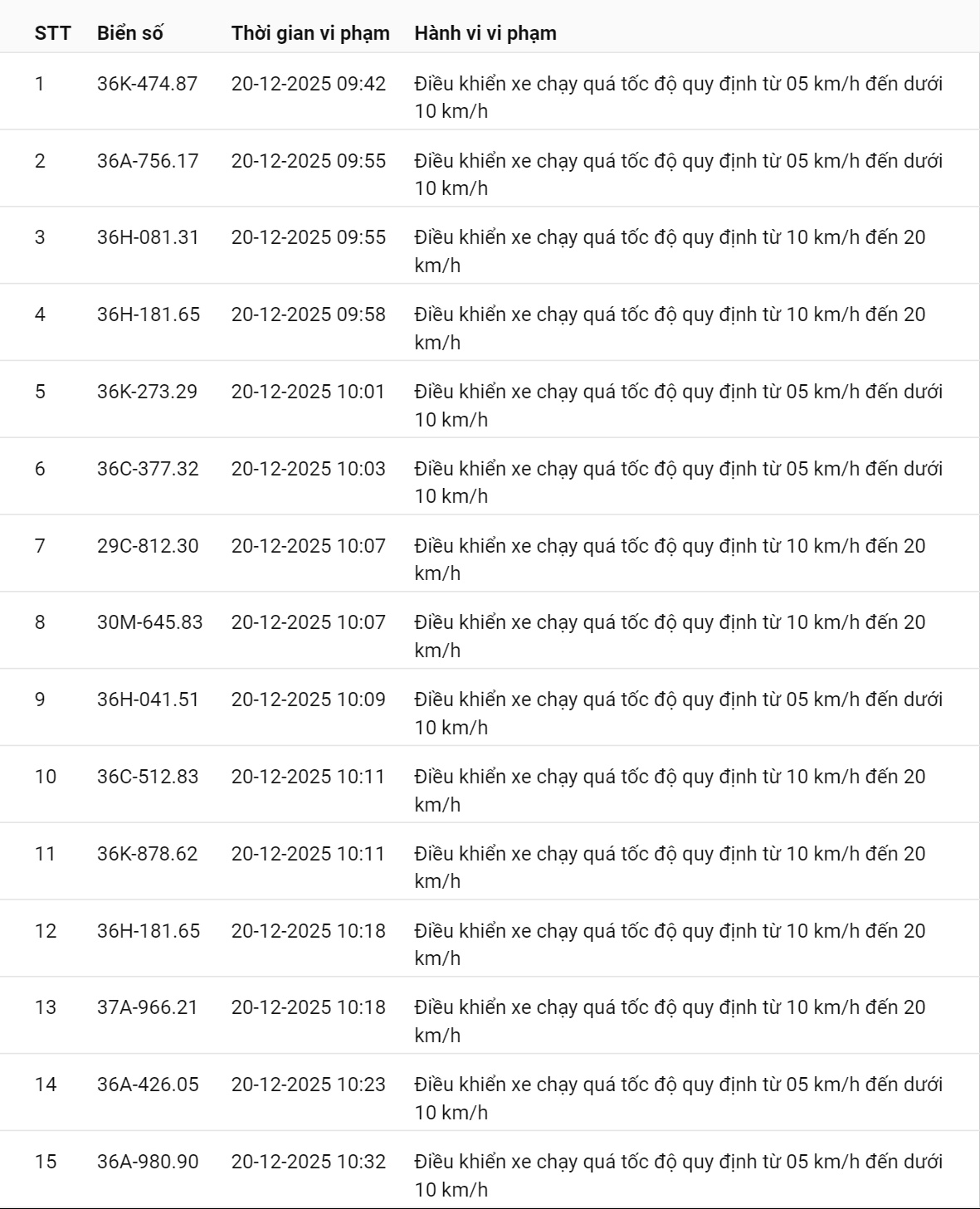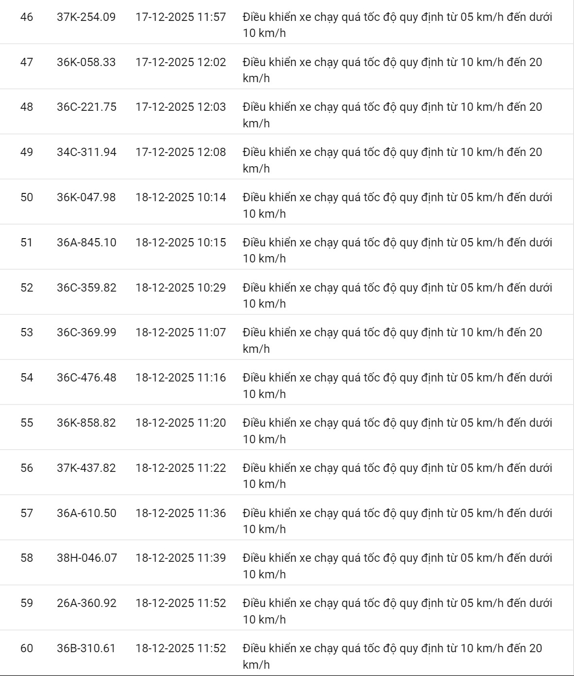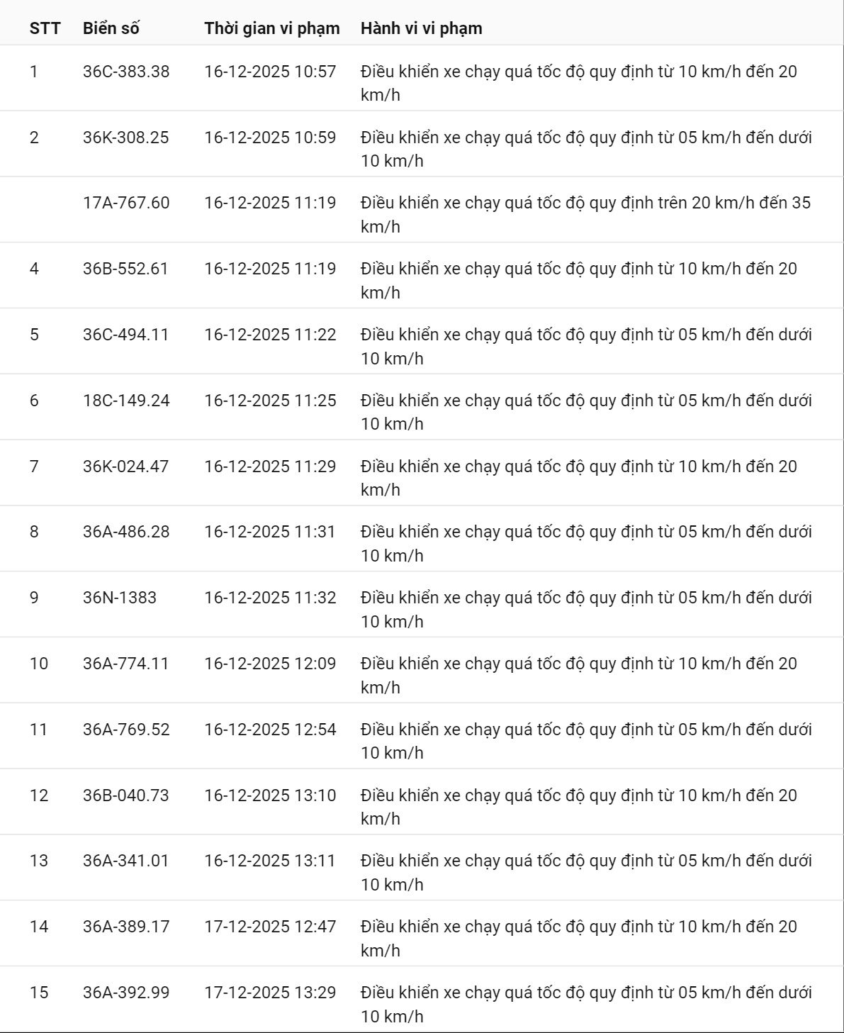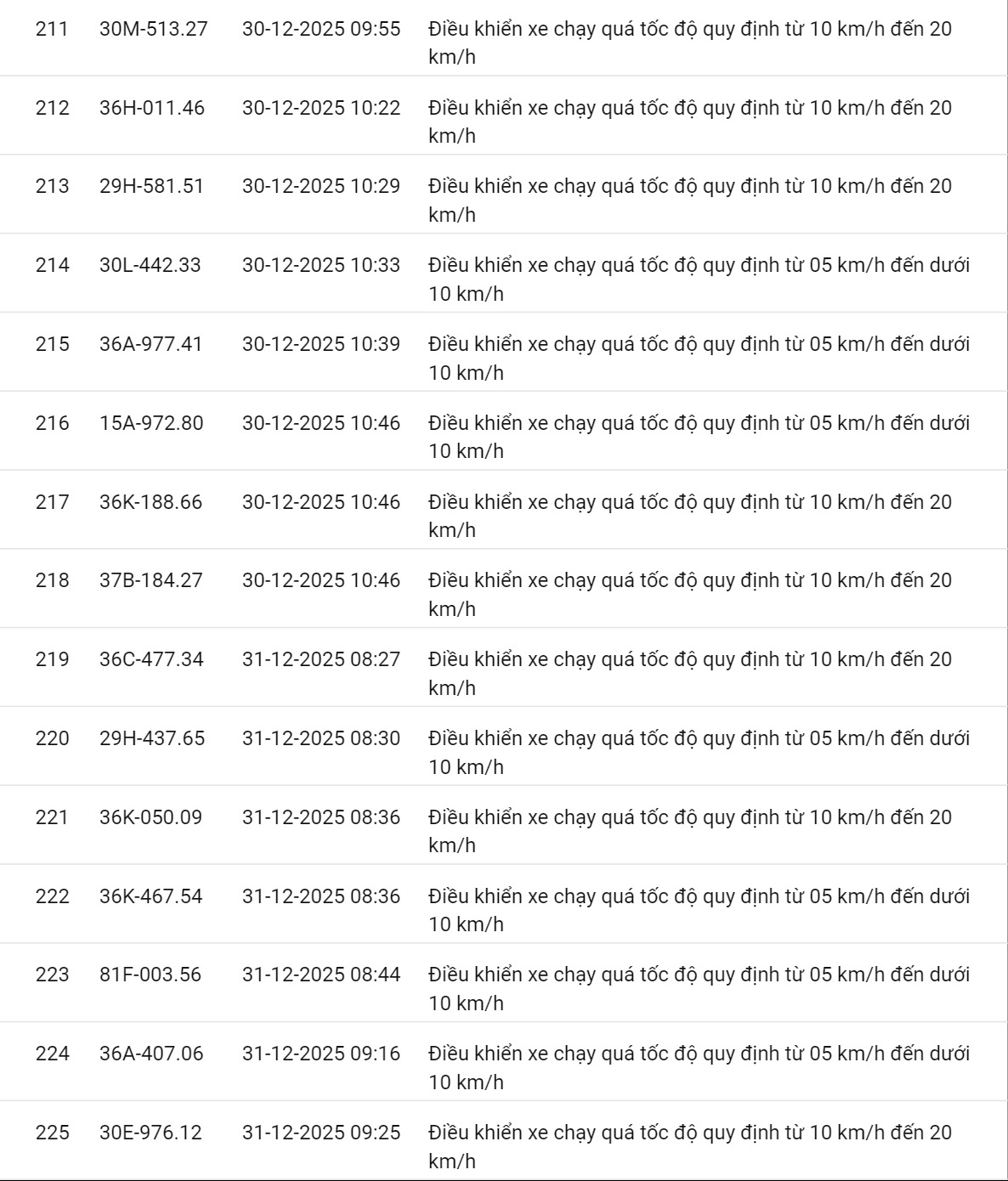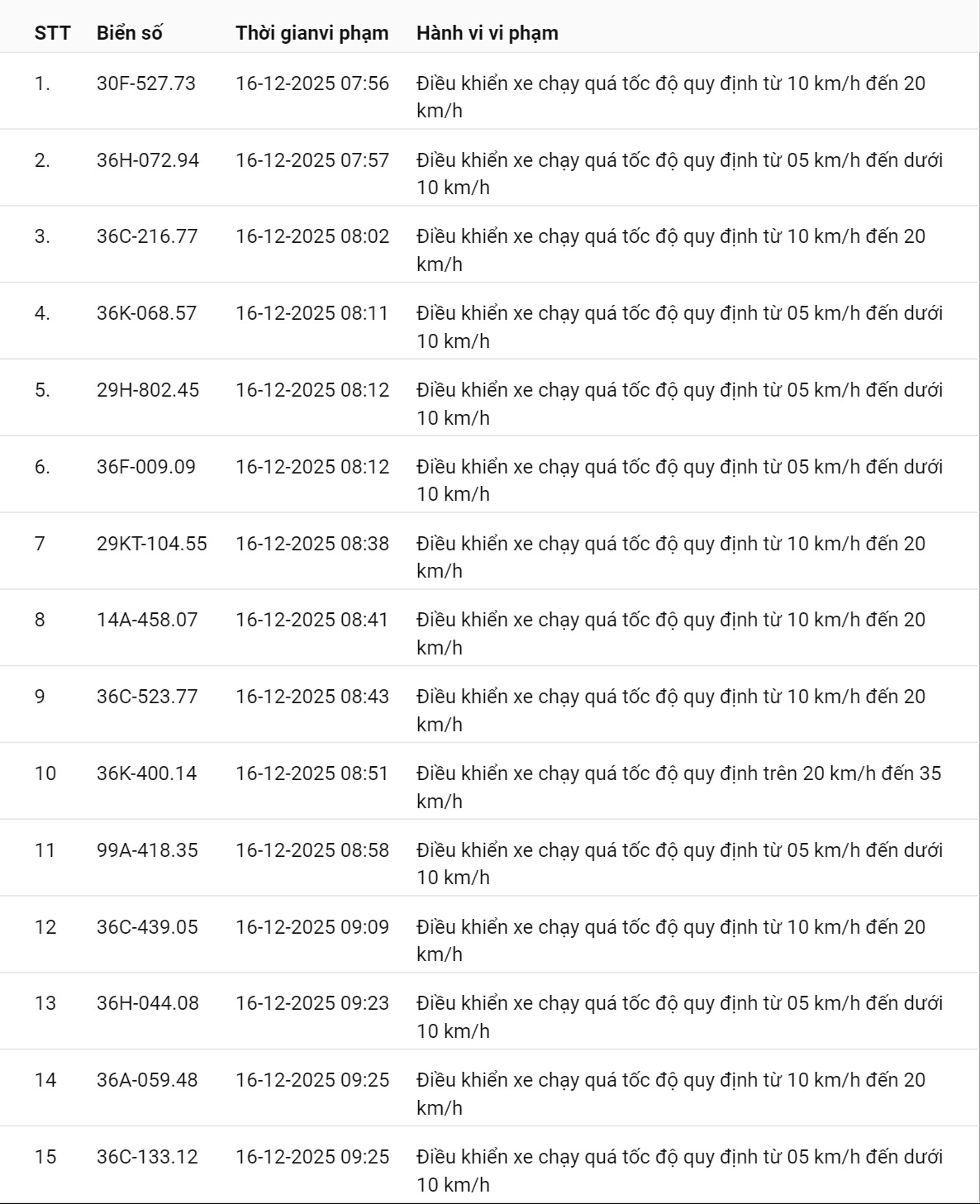 Trước đó, từ ngày 16/12/2025 đến ngày 31/12/2025, thông qua thiết bị kỹ thuật nghiệp vụ, các tổ công tác của phòng Cảnh sát giao thông Thanh Hoá đã phát hiện, ghi nhận bằng hình ảnh đối với tổng số 514 trường hợp phương tiện vi phạm quy định về tốc độ trên tuyến Quốc lộ. Danh sách cụ thể như sau: