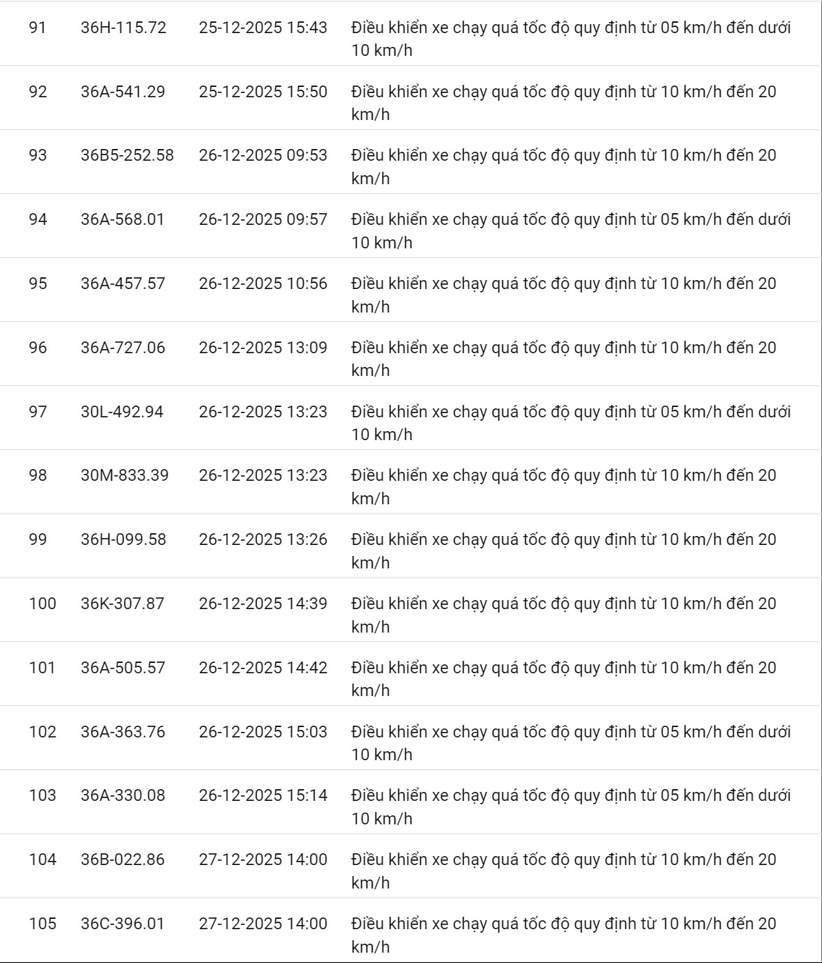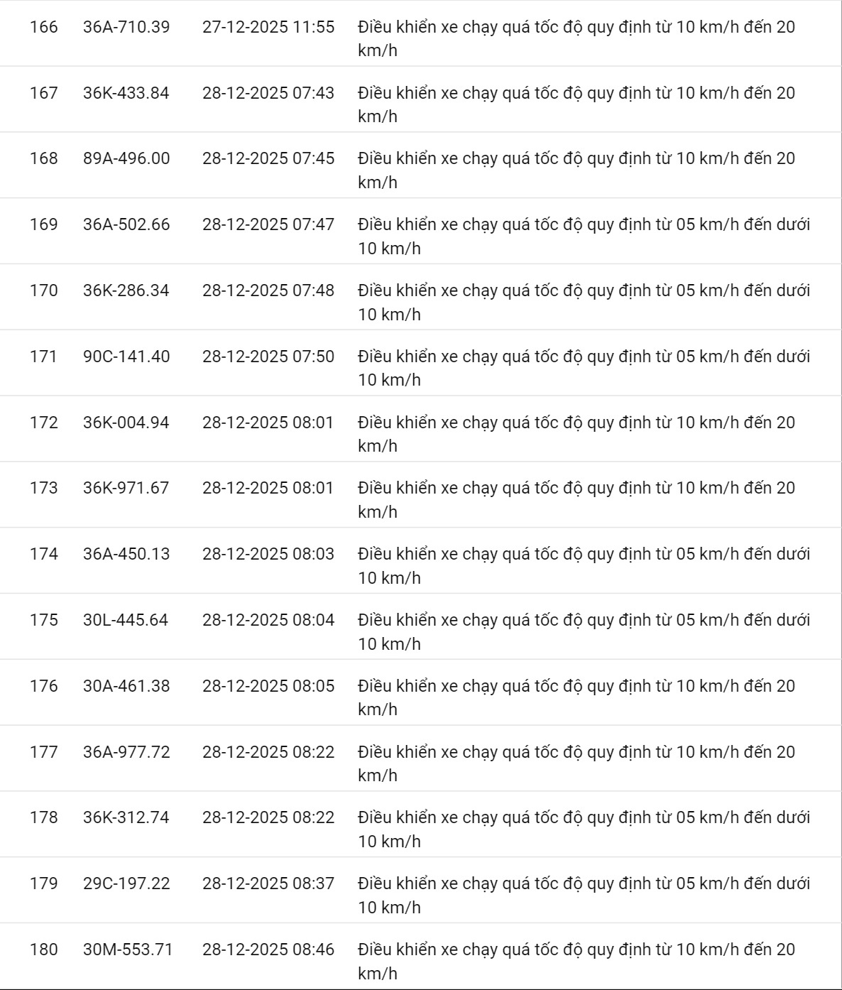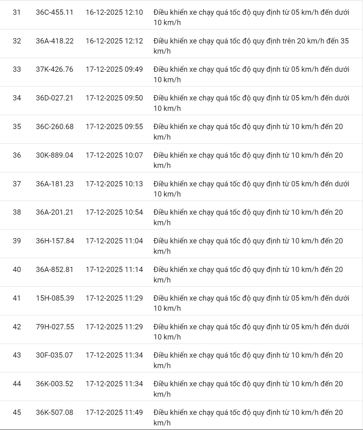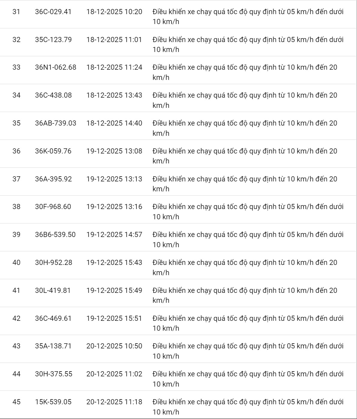 Trước đó, từ ngày 16/12/2025 đến ngày 31/12/2025, thông qua thiết bị kỹ thuật nghiệp vụ, các tổ công tác của phòng Cảnh sát giao thông Thanh Hoá đã phát hiện, ghi nhận bằng hình ảnh đối với tổng số 514 trường hợp phương tiện vi phạm quy định về tốc độ trên tuyến Quốc lộ. Danh sách cụ thể như sau: