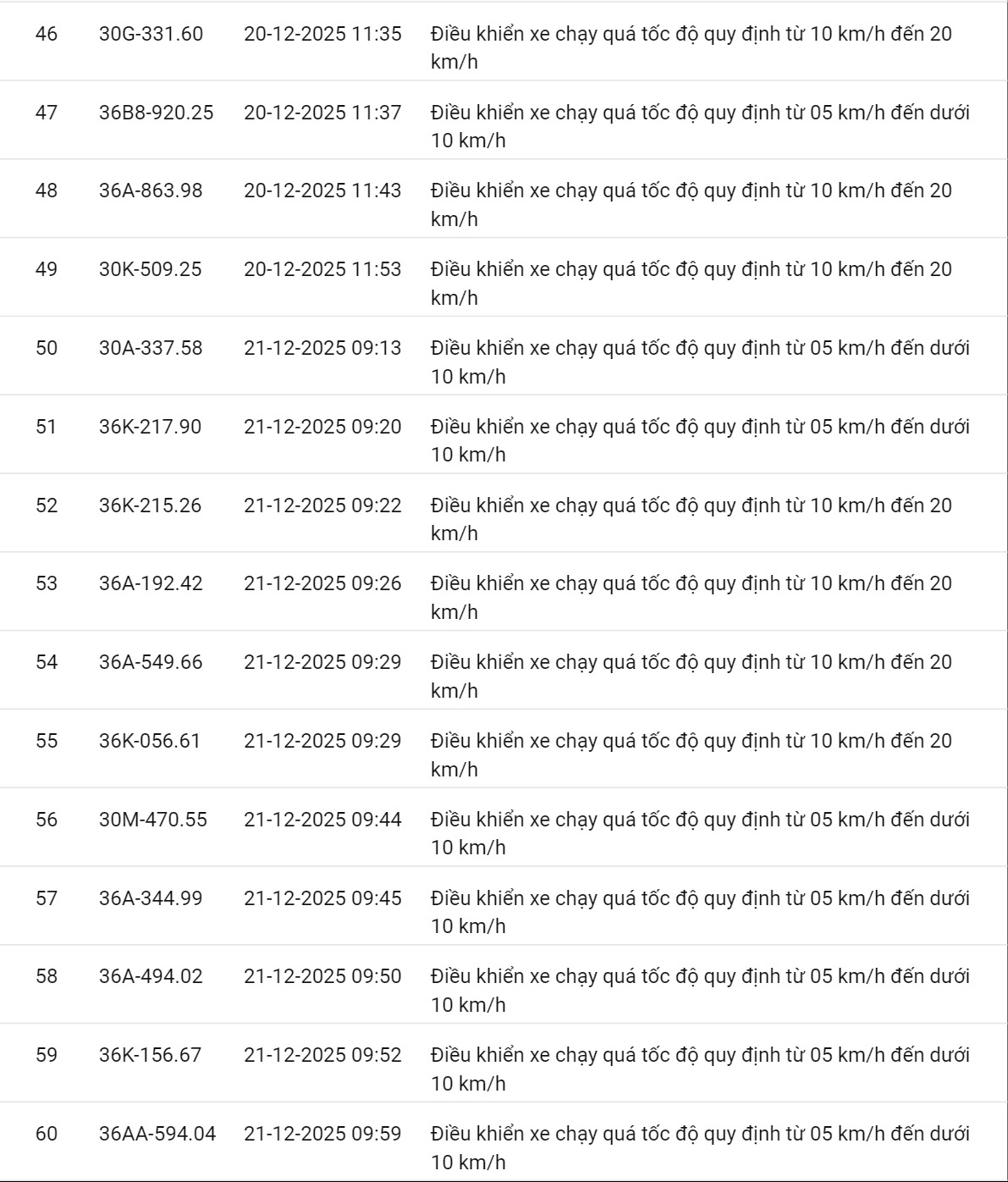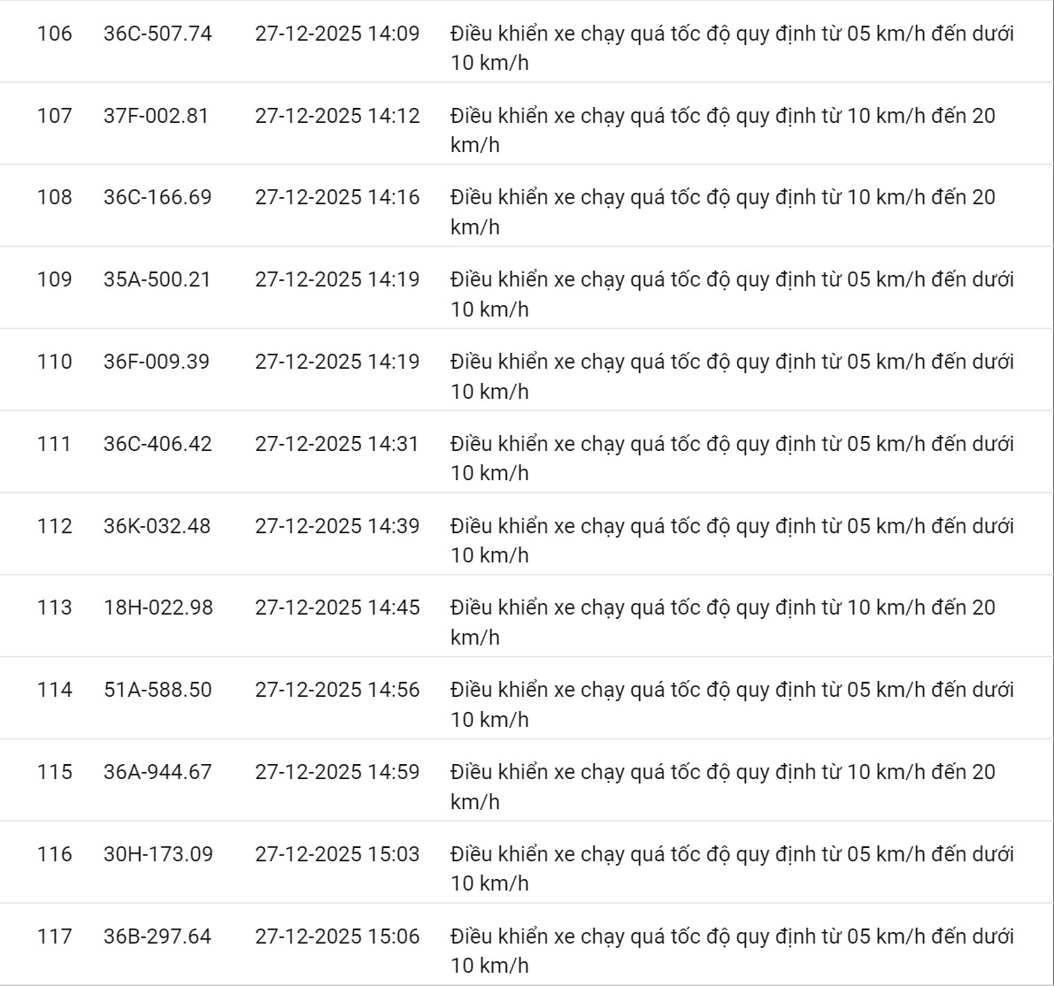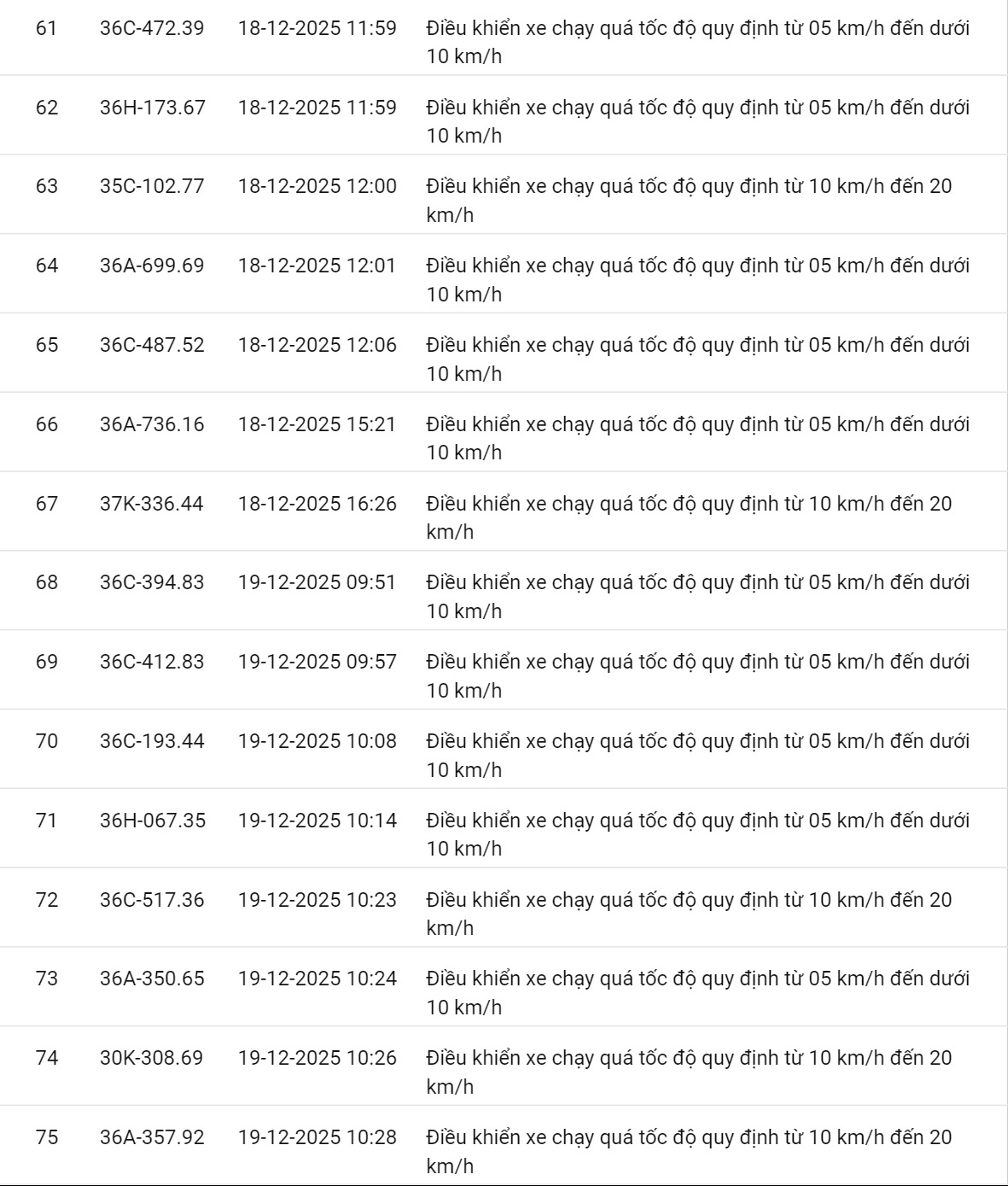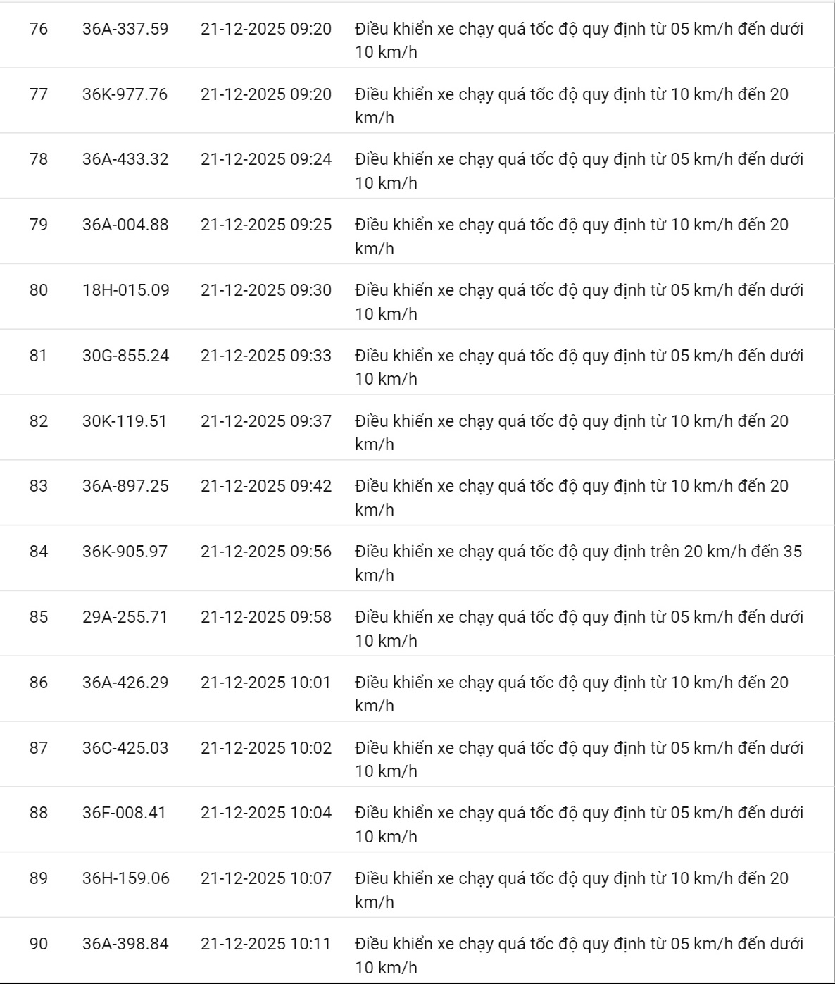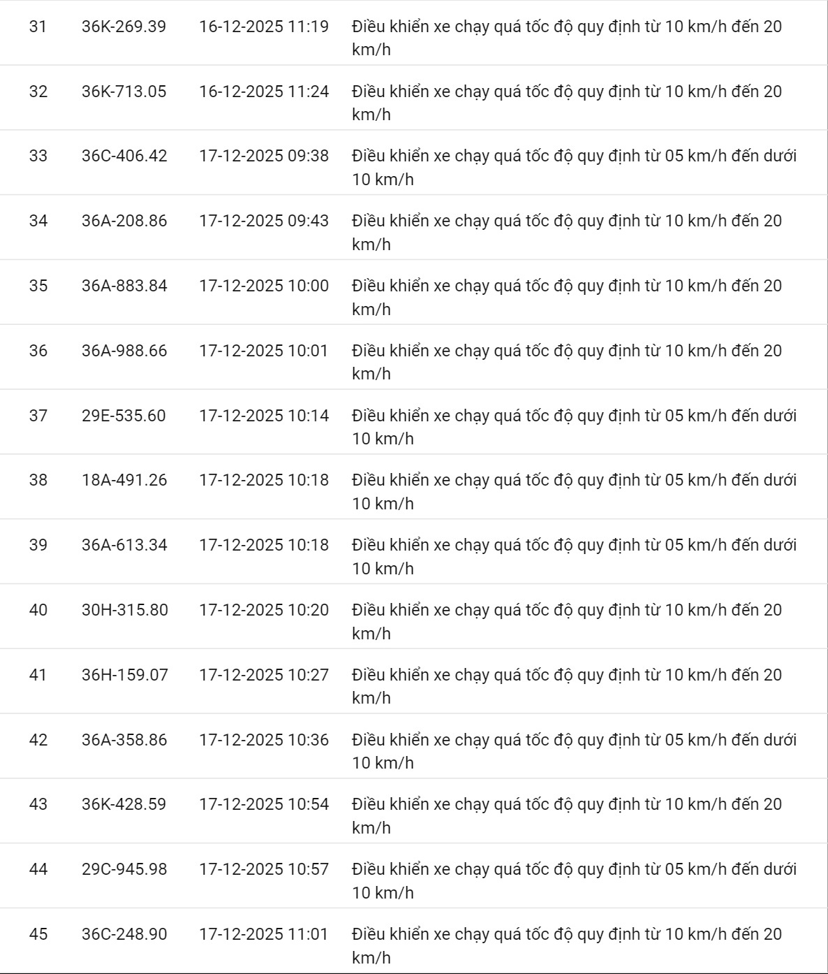 Trước đó, từ ngày 16/12/2025 đến ngày 31/12/2025, thông qua thiết bị kỹ thuật nghiệp vụ, các tổ công tác của phòng Cảnh sát giao thông Thanh Hoá đã phát hiện, ghi nhận bằng hình ảnh đối với tổng số 514 trường hợp phương tiện vi phạm quy định về tốc độ trên tuyến Quốc lộ. Danh sách cụ thể như sau: