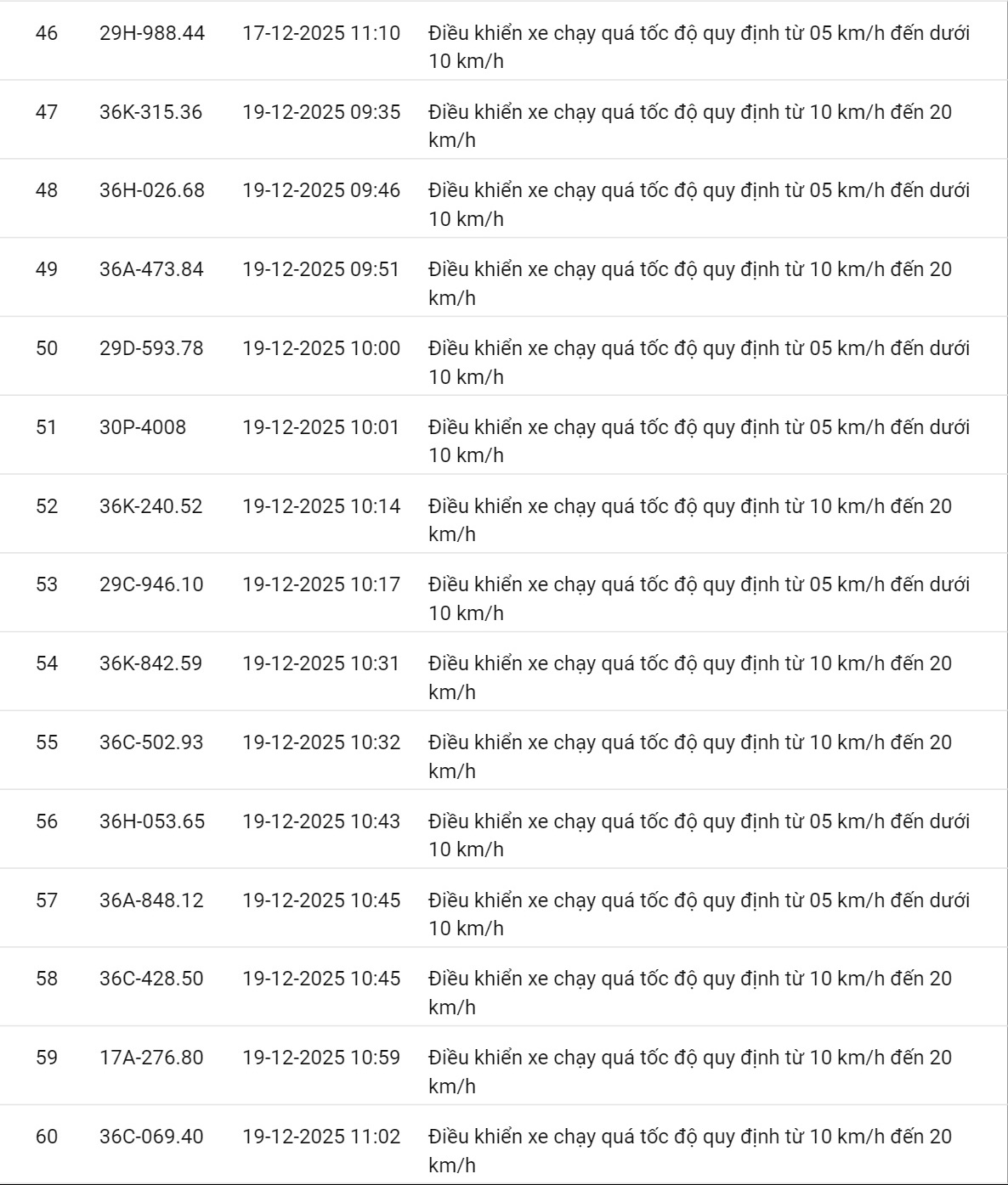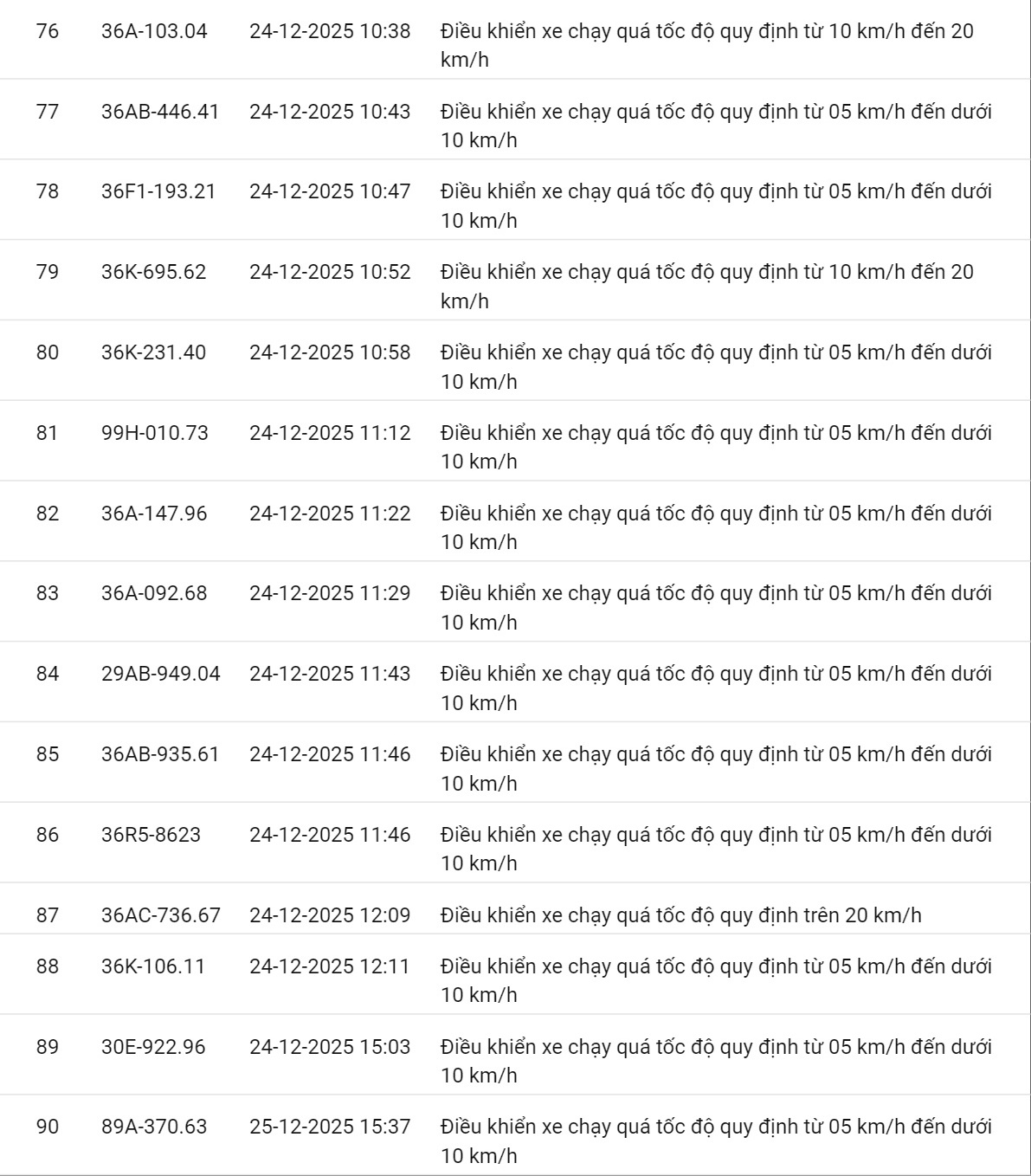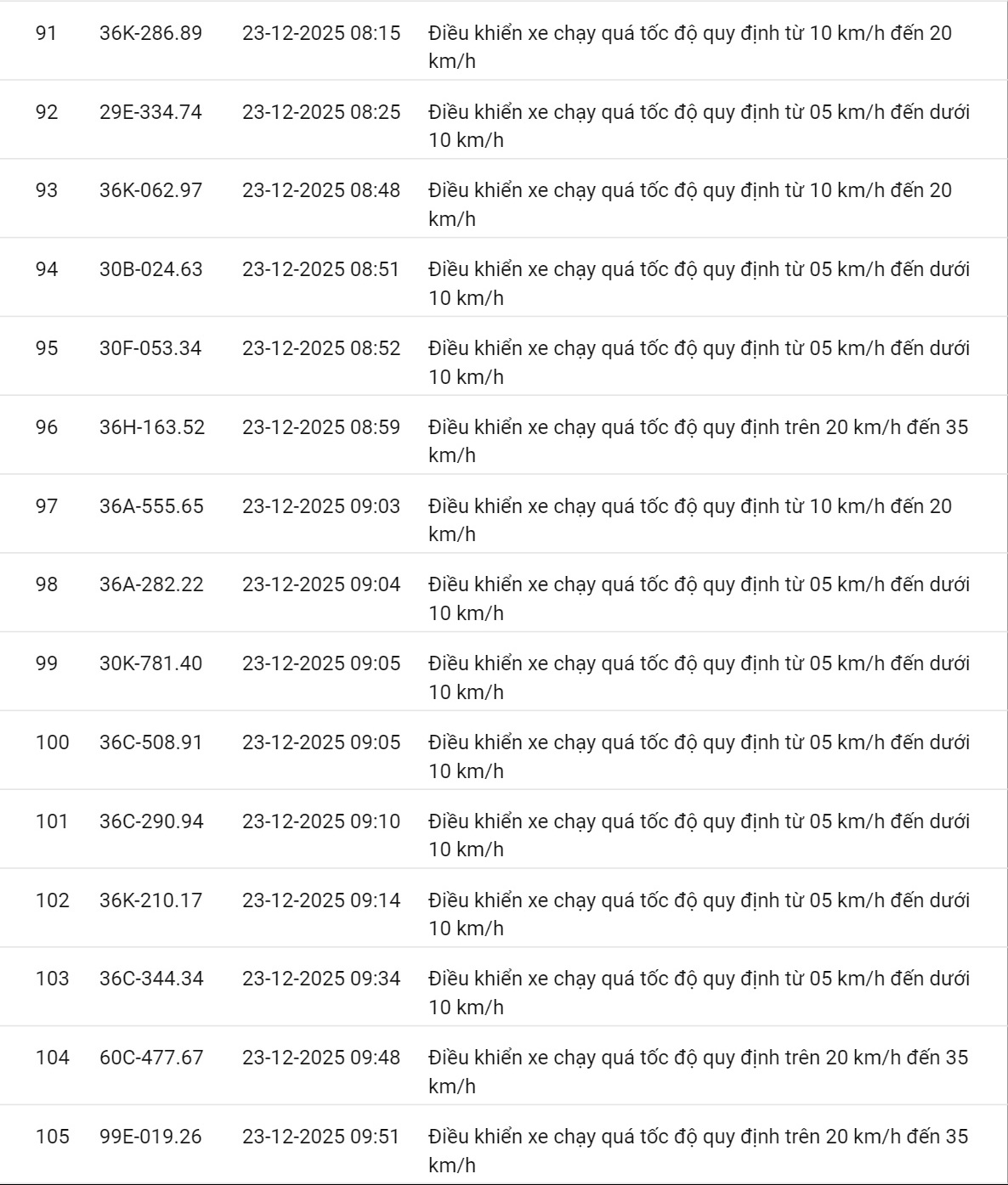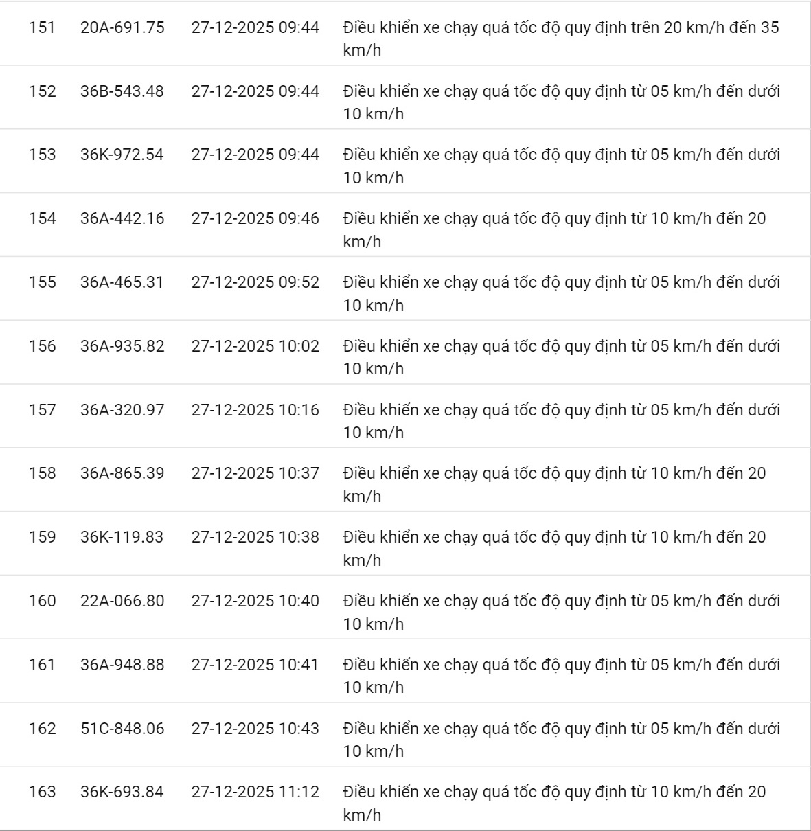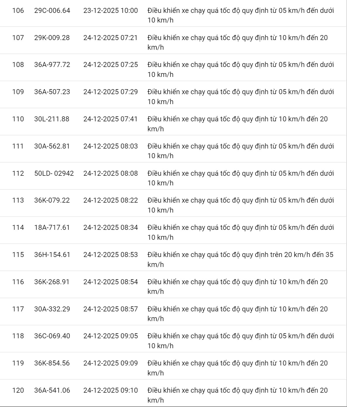 Trước đó, từ ngày 16/12/2025 đến ngày 31/12/2025, thông qua thiết bị kỹ thuật nghiệp vụ, các tổ công tác của phòng Cảnh sát giao thông Thanh Hoá đã phát hiện, ghi nhận bằng hình ảnh đối với tổng số 514 trường hợp phương tiện vi phạm quy định về tốc độ trên tuyến Quốc lộ. Danh sách cụ thể như sau:
