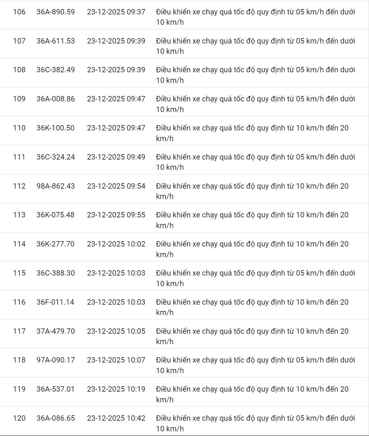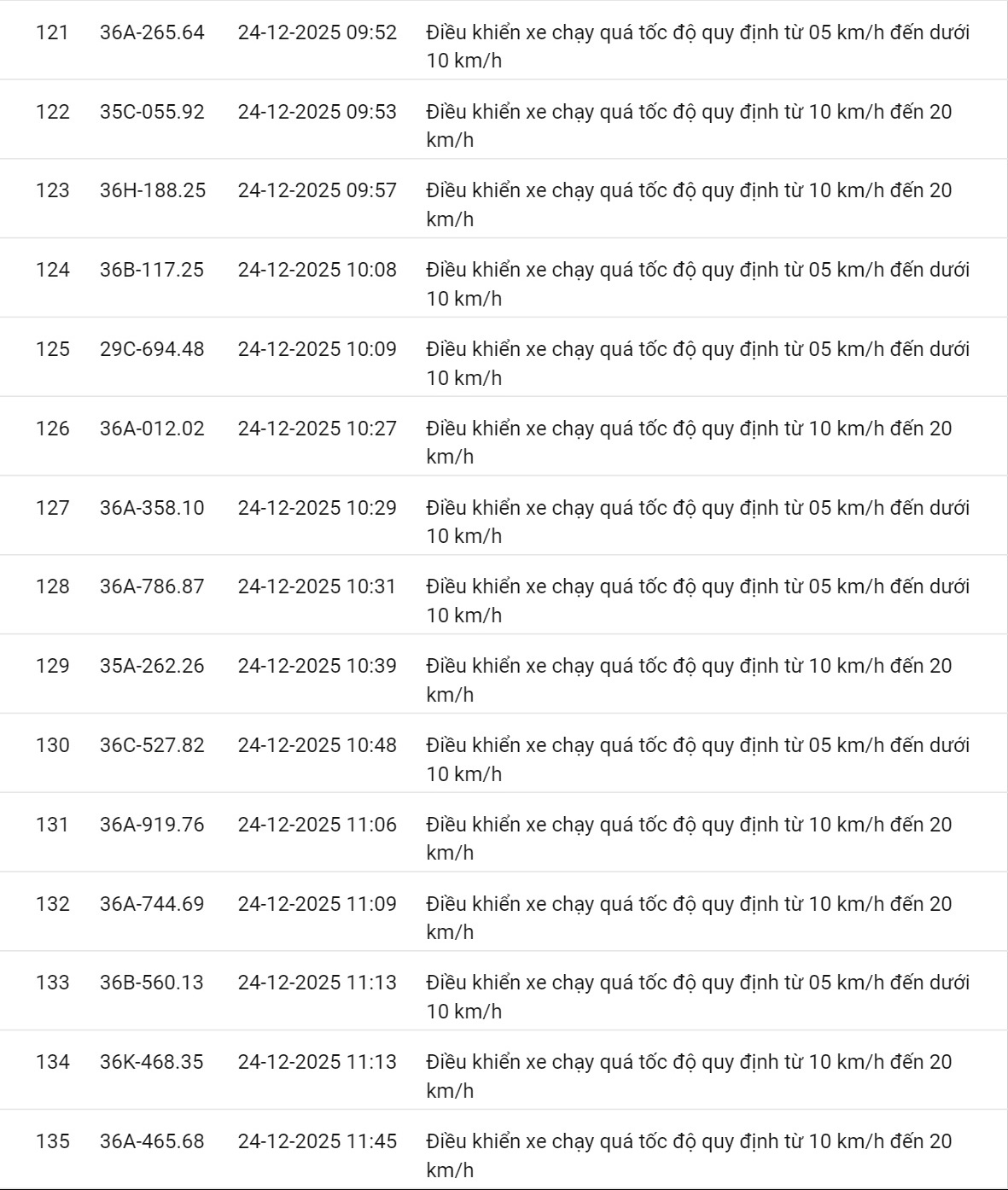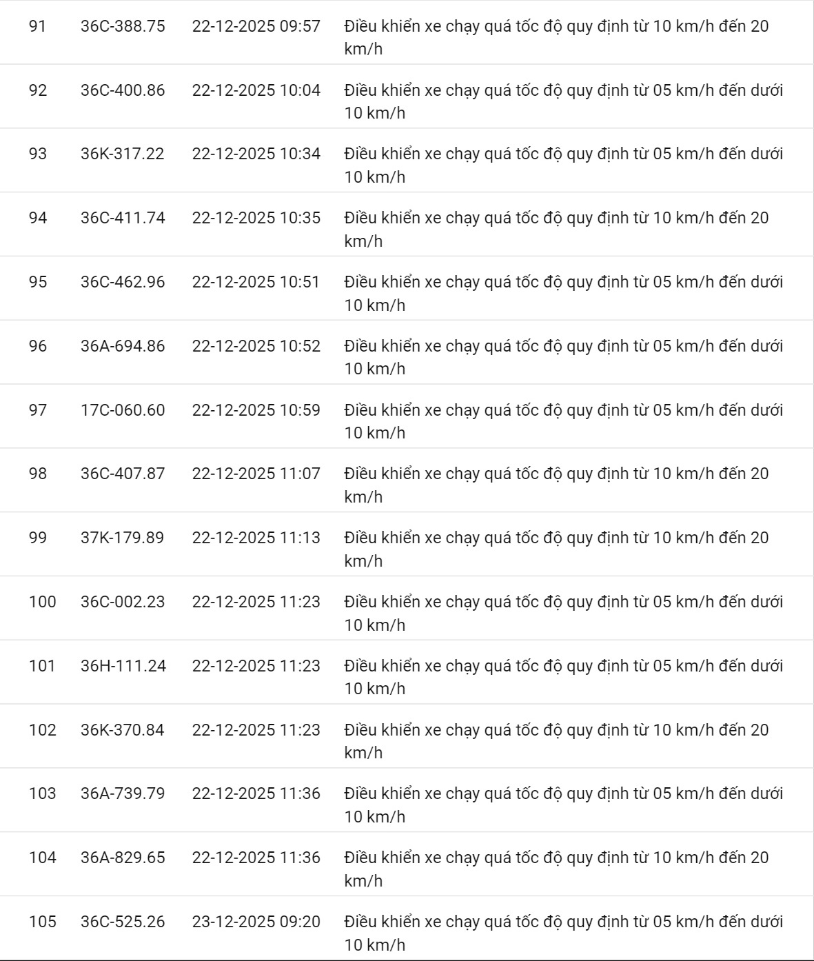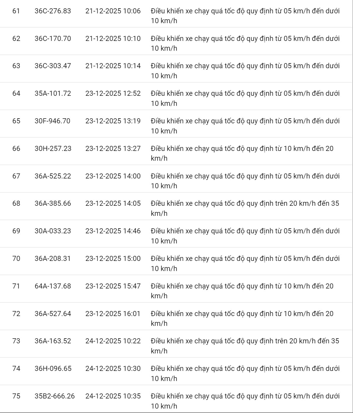 Trước đó, từ ngày 16/12/2025 đến ngày 31/12/2025, thông qua thiết bị kỹ thuật nghiệp vụ, các tổ công tác của phòng Cảnh sát giao thông Thanh Hoá đã phát hiện, ghi nhận bằng hình ảnh đối với tổng số 514 trường hợp phương tiện vi phạm quy định về tốc độ trên tuyến Quốc lộ. Danh sách cụ thể như sau: