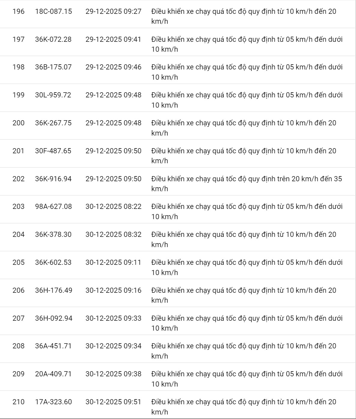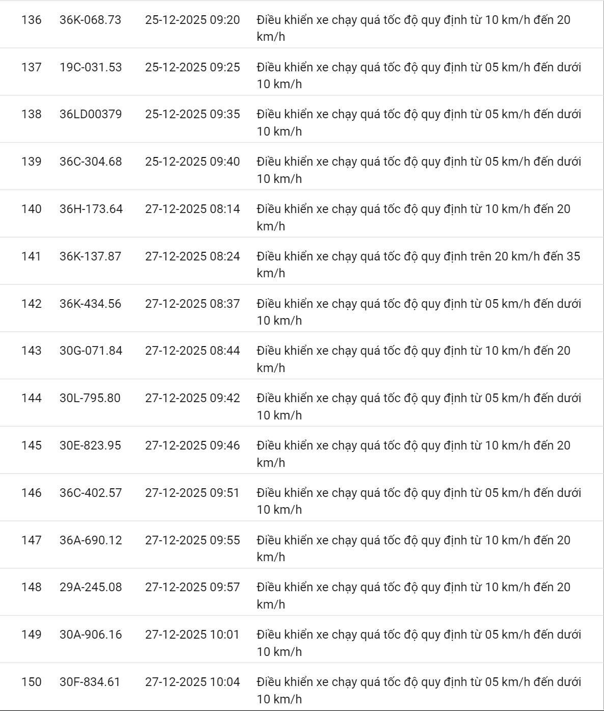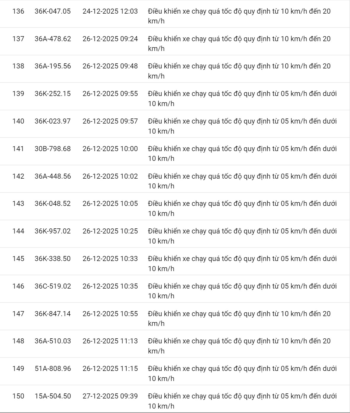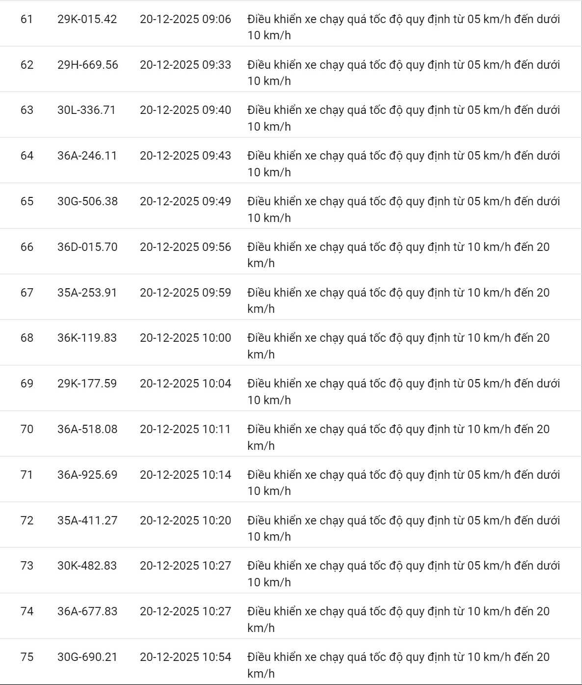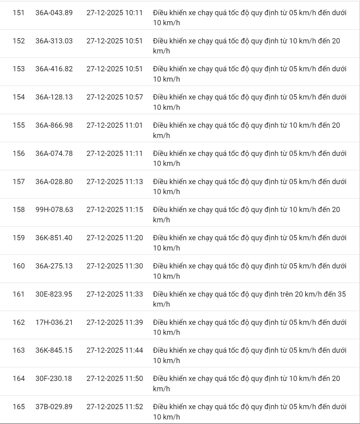 Trước đó, từ ngày 16/12/2025 đến ngày 31/12/2025, thông qua thiết bị kỹ thuật nghiệp vụ, các tổ công tác của phòng Cảnh sát giao thông Thanh Hoá đã phát hiện, ghi nhận bằng hình ảnh đối với tổng số 514 trường hợp phương tiện vi phạm quy định về tốc độ trên tuyến Quốc lộ. Danh sách cụ thể như sau: