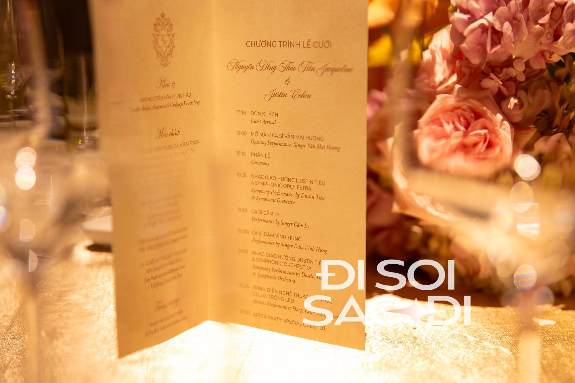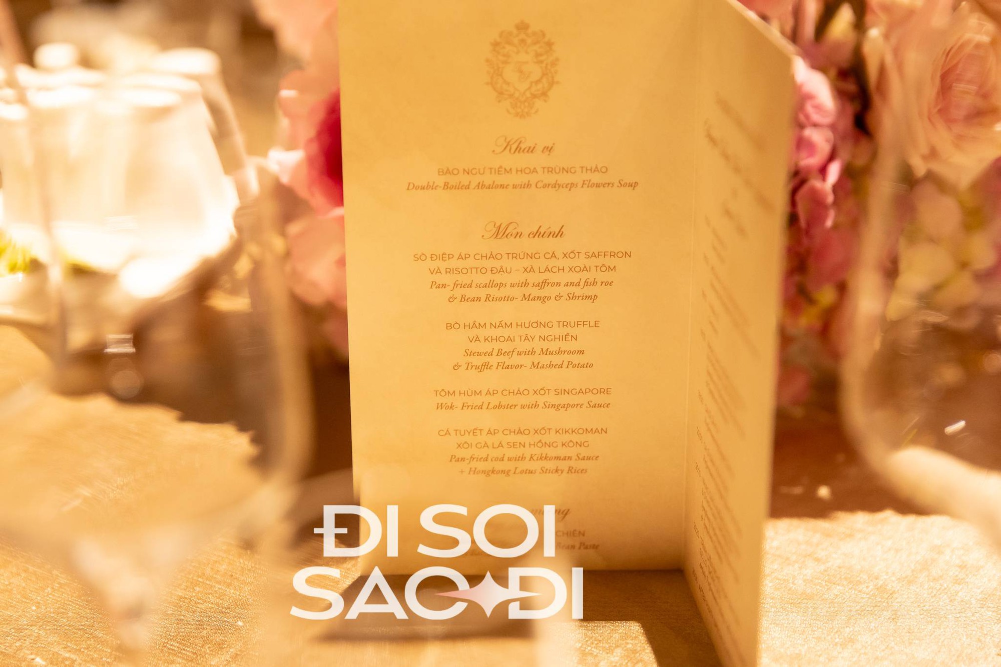 Ngay trước giờ diễn ra tiệc, menu cưới đã lộ diện và nhanh chóng thu hút sự chú ý. Được biết, bữa tiệc tối nay có 63 bàn với sơ đồ vị trí bàn tiệc đặt ngay tại sảnh đón để các khách mời dễ dàng tra cứu. Điều khiến nhiều người chú ý là toàn bộ thực đơn đều là những món vốn được xem là "biểu tượng" của ẩm thực xa xỉ.